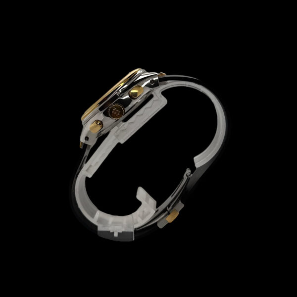 Das Gehäuse aus Edelstahl in Kombination mit 18-karätigem Gelbgold zeigt sich in sehr gutem Erhaltungszustand. Der Rückendeckel trägt die „MODELE DEPOSE“-Gravur.