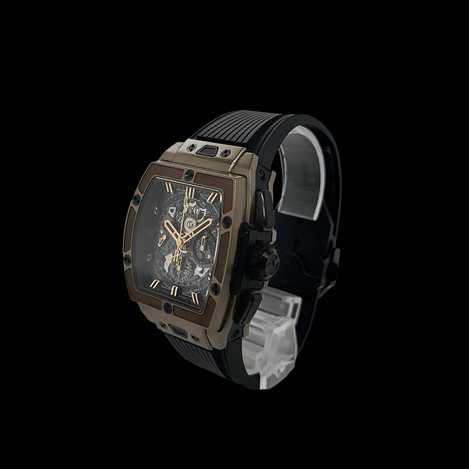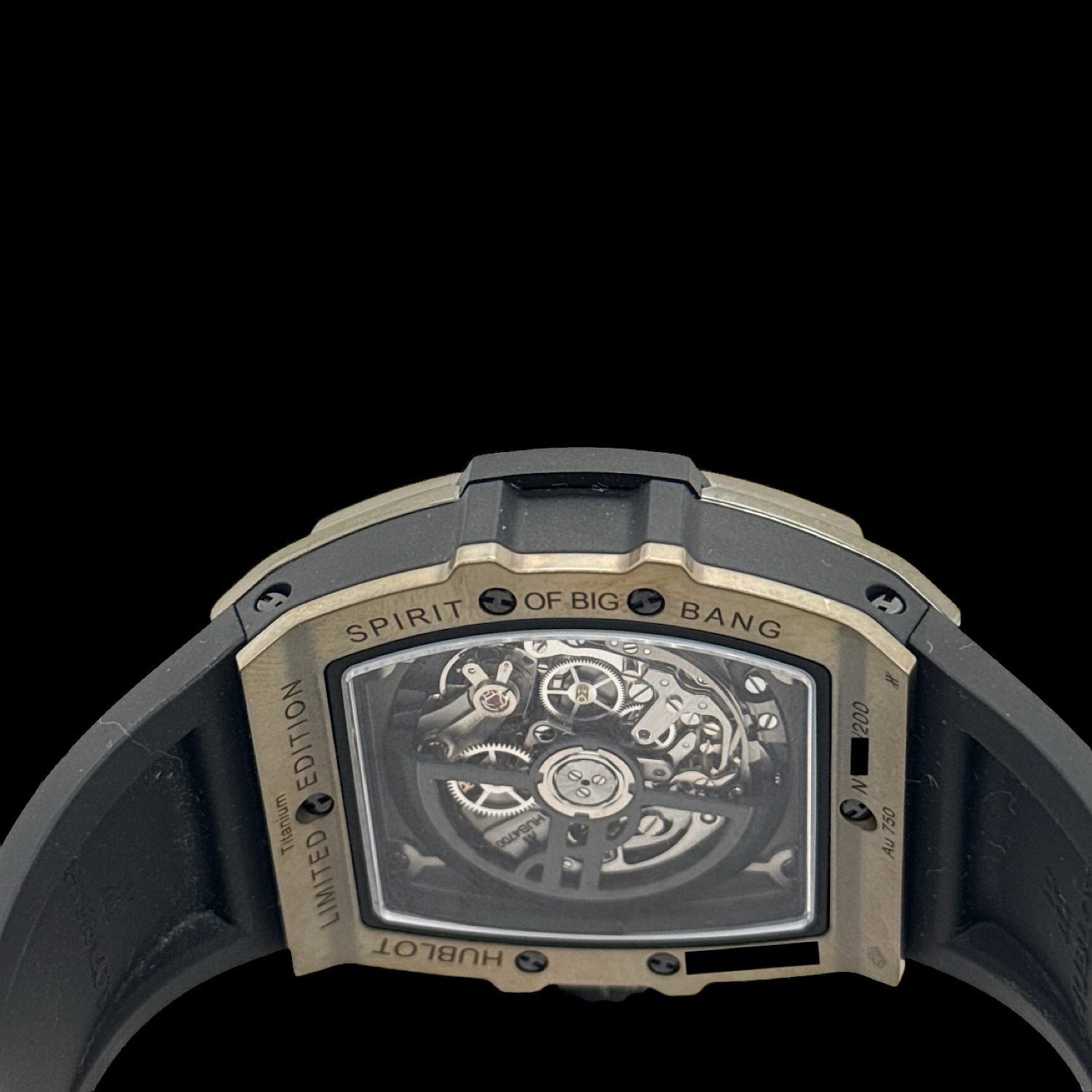 Das 42-mm-Tonneau-Gehäuse der Spirit of Big Bang, Referenz 642.MX.0130.RX, trägt diese Innovation auf dem Handgelenk: Ein transparentes Saphirglas-Zifferblatt gibt den Blick frei auf den skelettiert arbeitenden Kaliber HUB4700, flankiert von der charakteristischen schwarzen Mittelzone und sechs H-förmigen Titanschrauben. Ein schwarzes Gummiarmband mit Faltschließe aus Keramik und Titan rundet das Bild ab.