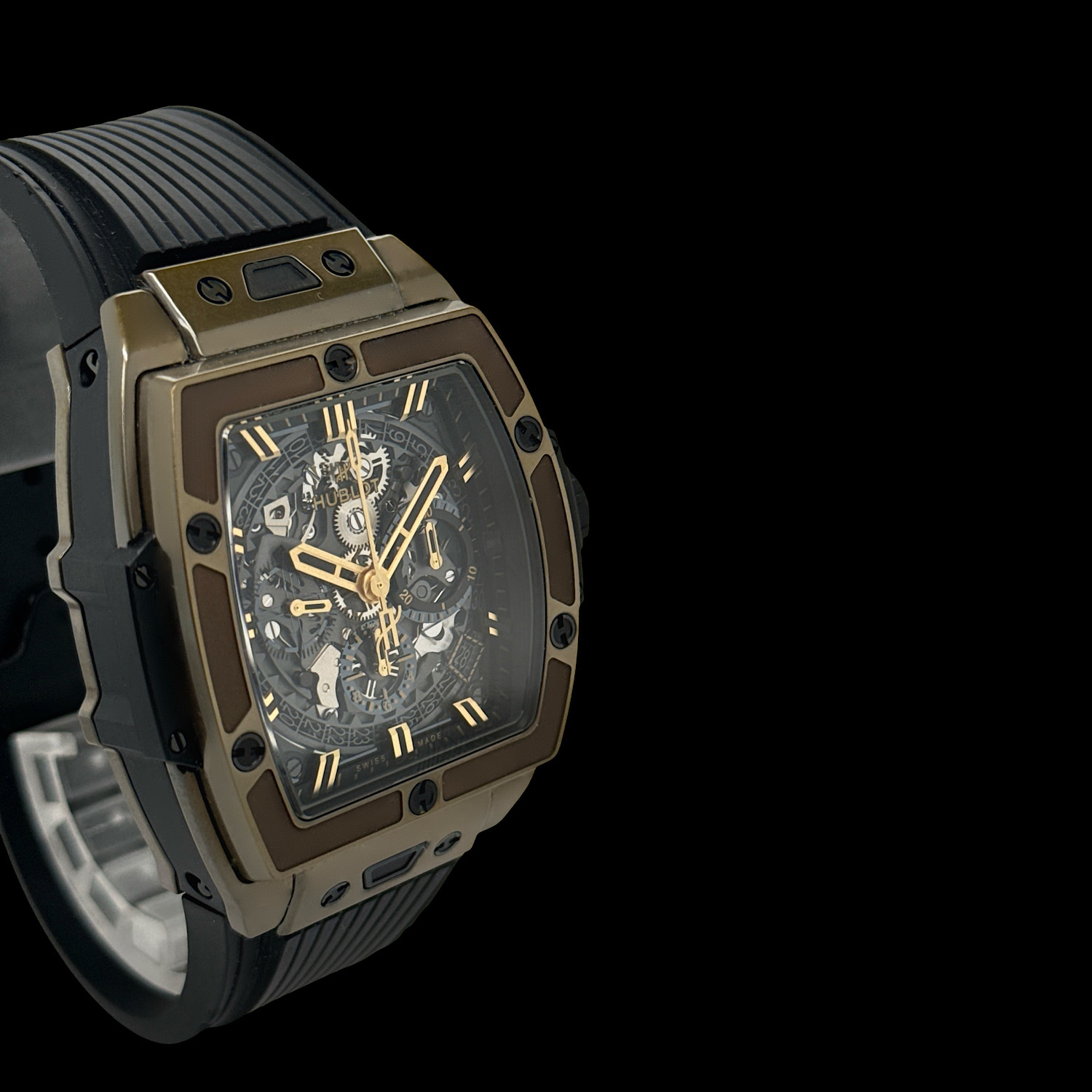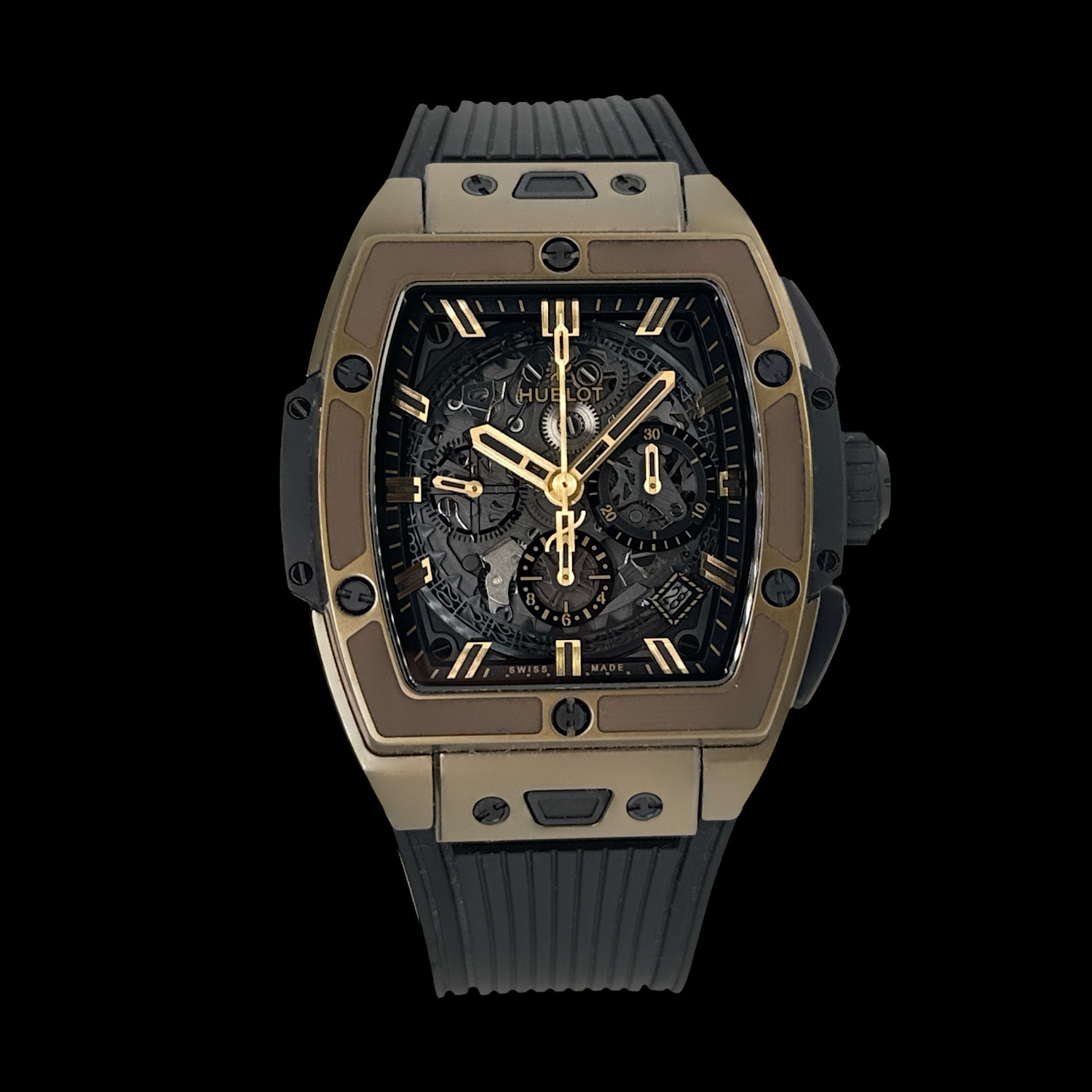 Das Gehäuse aus Hublots patentiertem 18-karätigem Magic Gold befindet sich in einem ausgezeichneten Zustand mit nur minimalen Tragespuren.