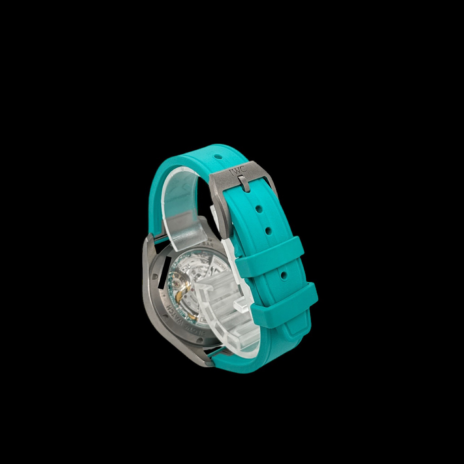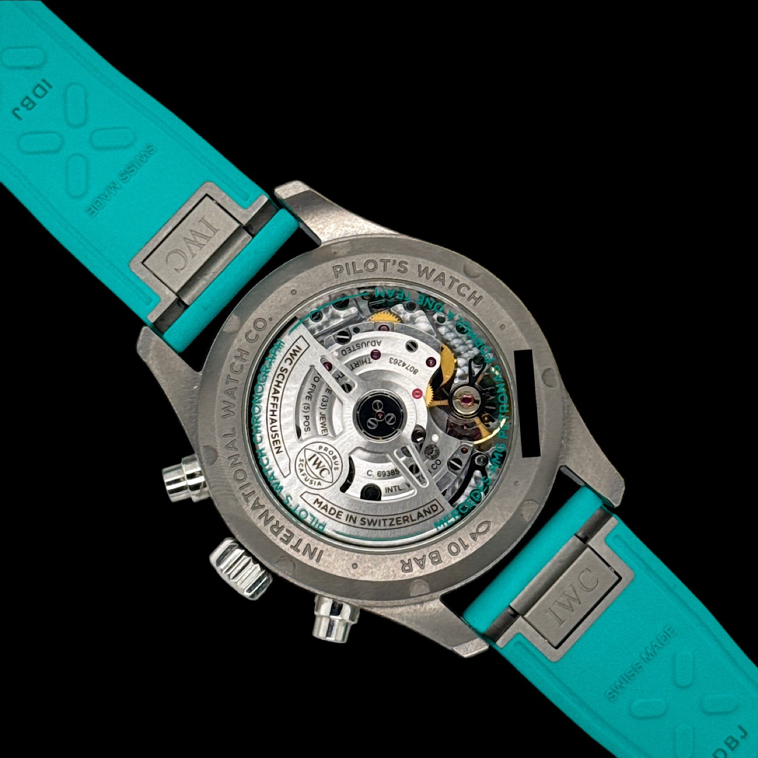 Das sandgestrahlte Gehäuse aus Titan misst 41 mm im Durchmesser und besticht durch seinen dezent gräulichen Schimmer mit polierten Akzenten an Lünette, Krone und Drückern. Hinter dem gewölbten, beidseitig entspiegelten Saphirglas zeigt sich ein mattschwarzes Zifferblatt, dessen Indizes, Zeiger und Skalierungen im charakteristischen Petronas-Grün leuchten. Durch den Saphirglasboden offenbart sich das IWC-Manufakturkaliber 69385 – ein Chronographenwerk in klassischer Säulenradbauweise mit 33 Lagersteinen, 28.800 Halbschwingungen pro Stunde und 46 Stunden Gangreserve.