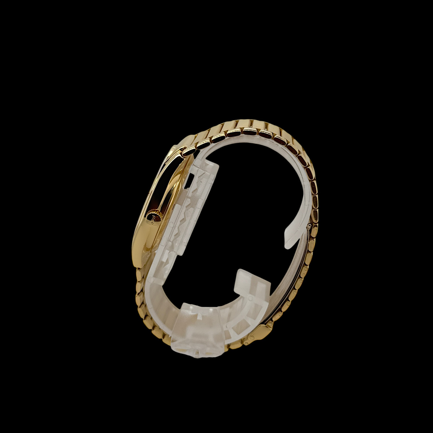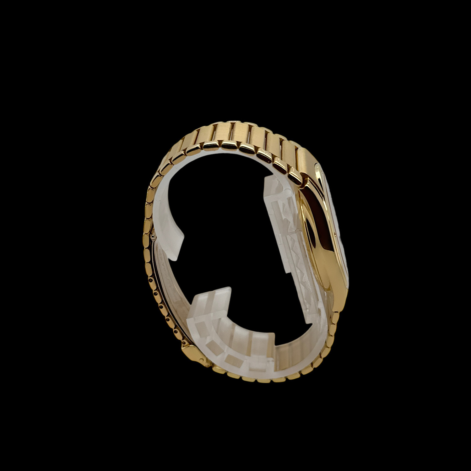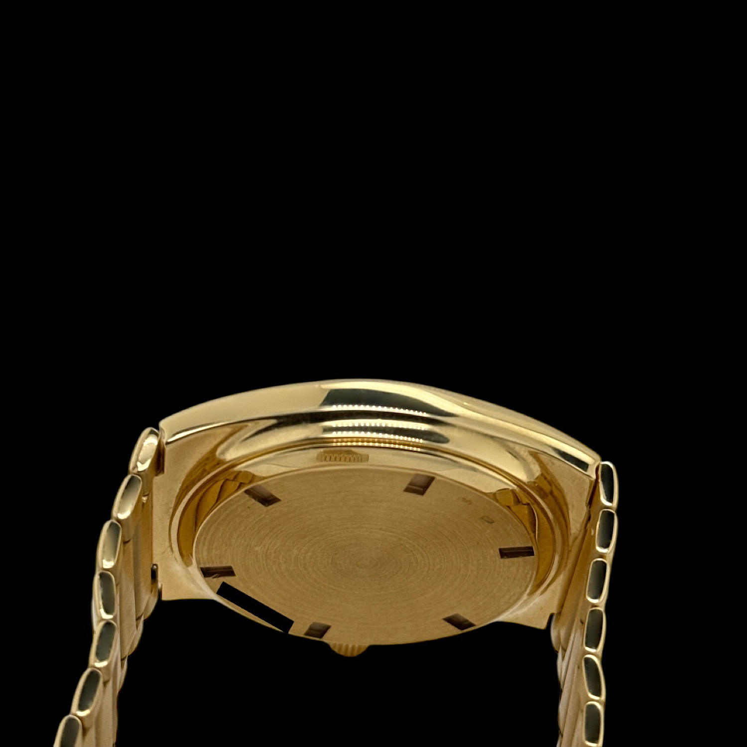 Gerald Genta schuf das tonneau-förmige Gehäuse aus massivem 18-karätigem Gelbgold, das nahtlos in ein dreigliedriges Armband fließt. 34 mm Durchmesser, die sich am Handgelenk deutlich präsenter anfühlen.
