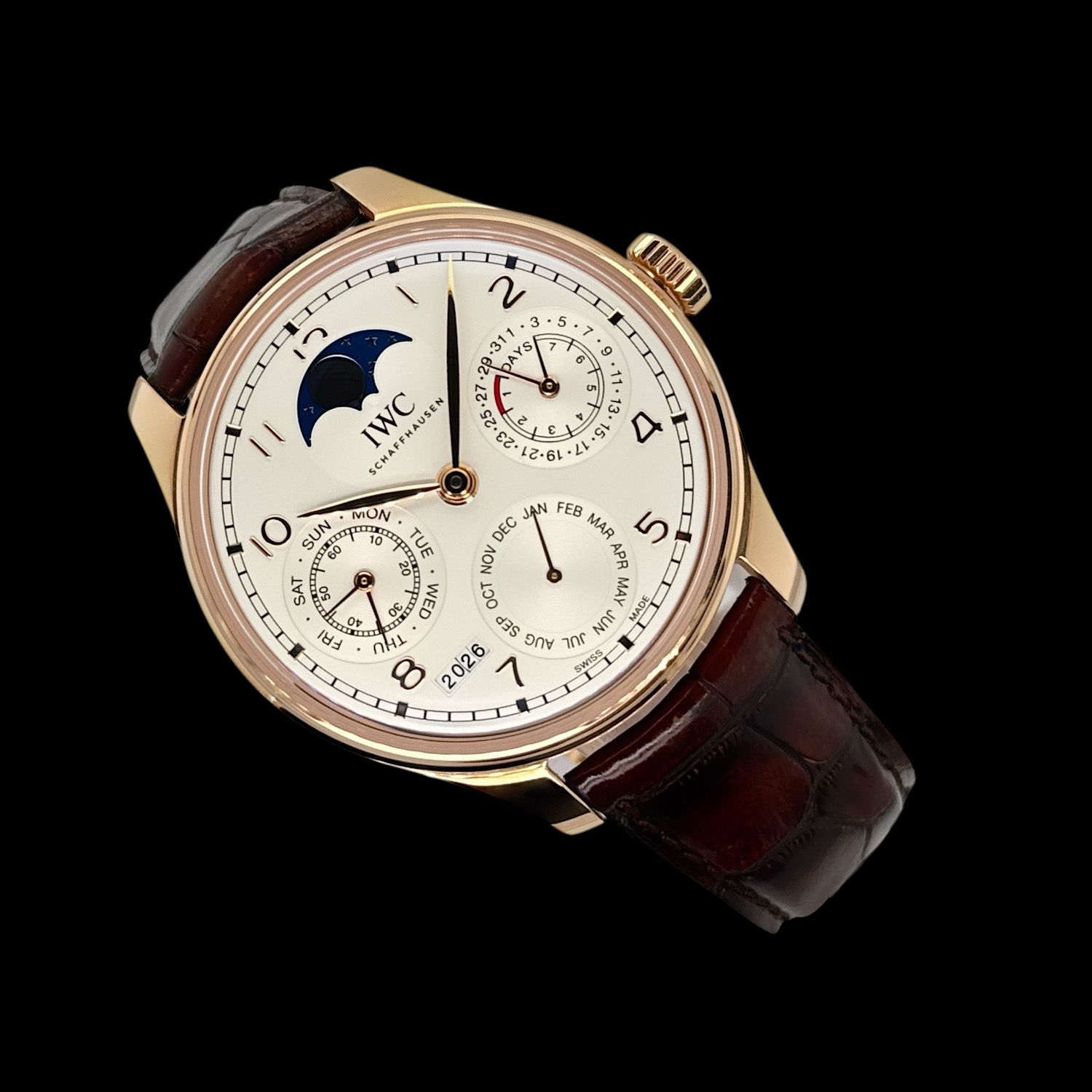 Das silberne Zifferblatt mit aufgesetzten Roségold-Ziffern zeigt vier strukturierte Hilfszifferblätter. Die Mondphase erreicht eine Genauigkeit von 577 Jahren. Vierstellige Jahresanzeige, Schaltjahrerkennung und sieben Tage Gangreserve – alle Funktionen über die Krone einstellbar, ohne zusätzliche Drücker.