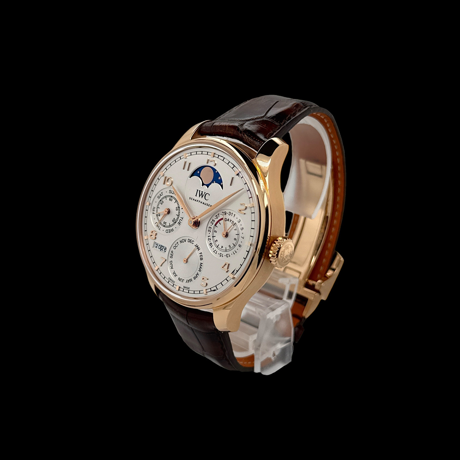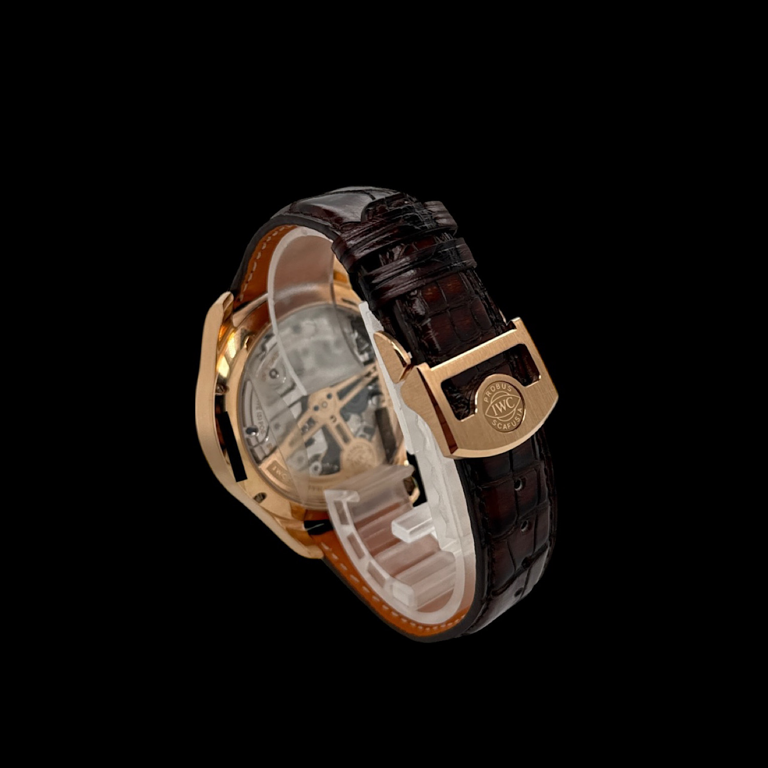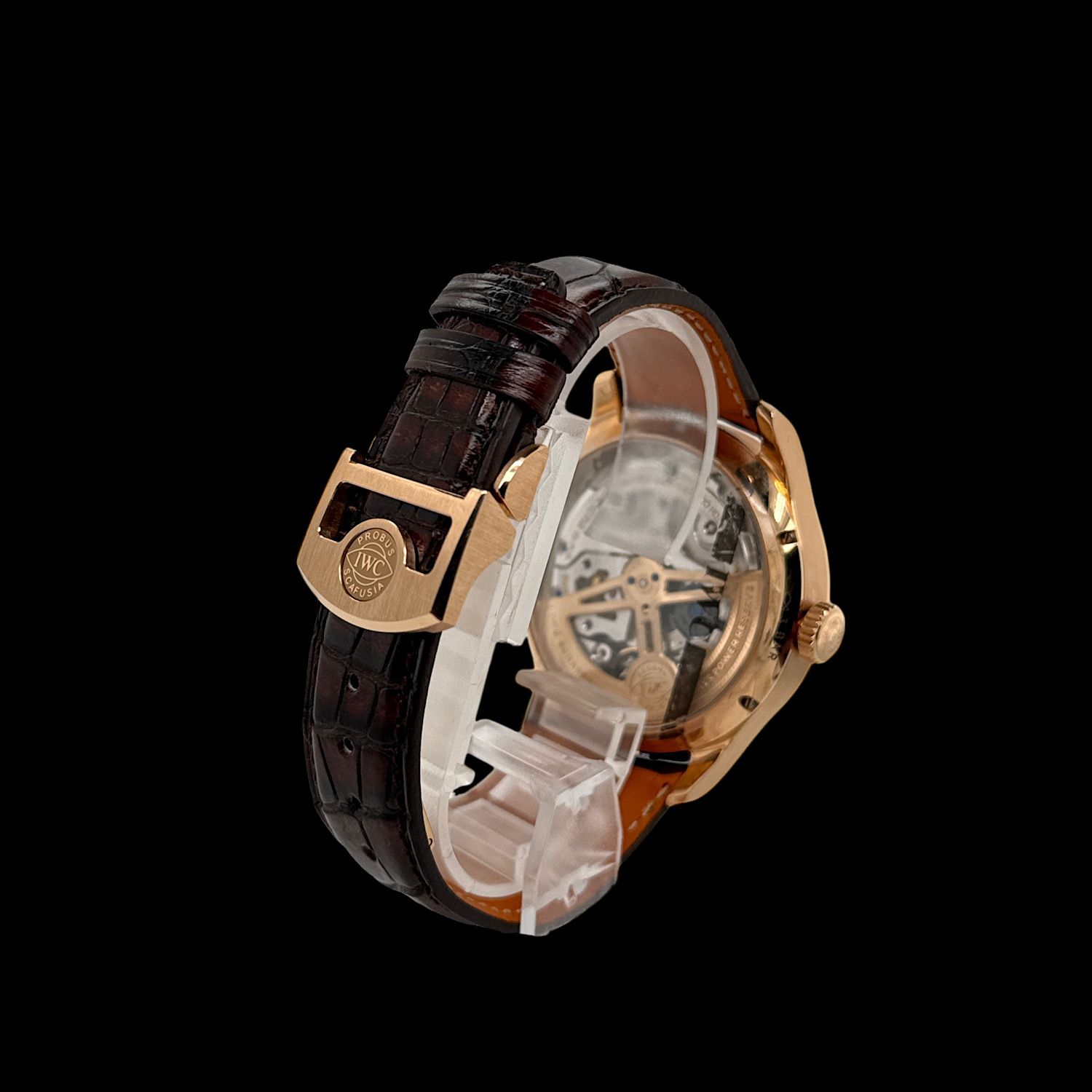 Das Lederarmband und die IWC Faltschließe aus 18-karätigem Rotgold befindet sich in wenig getragenem Zustand.