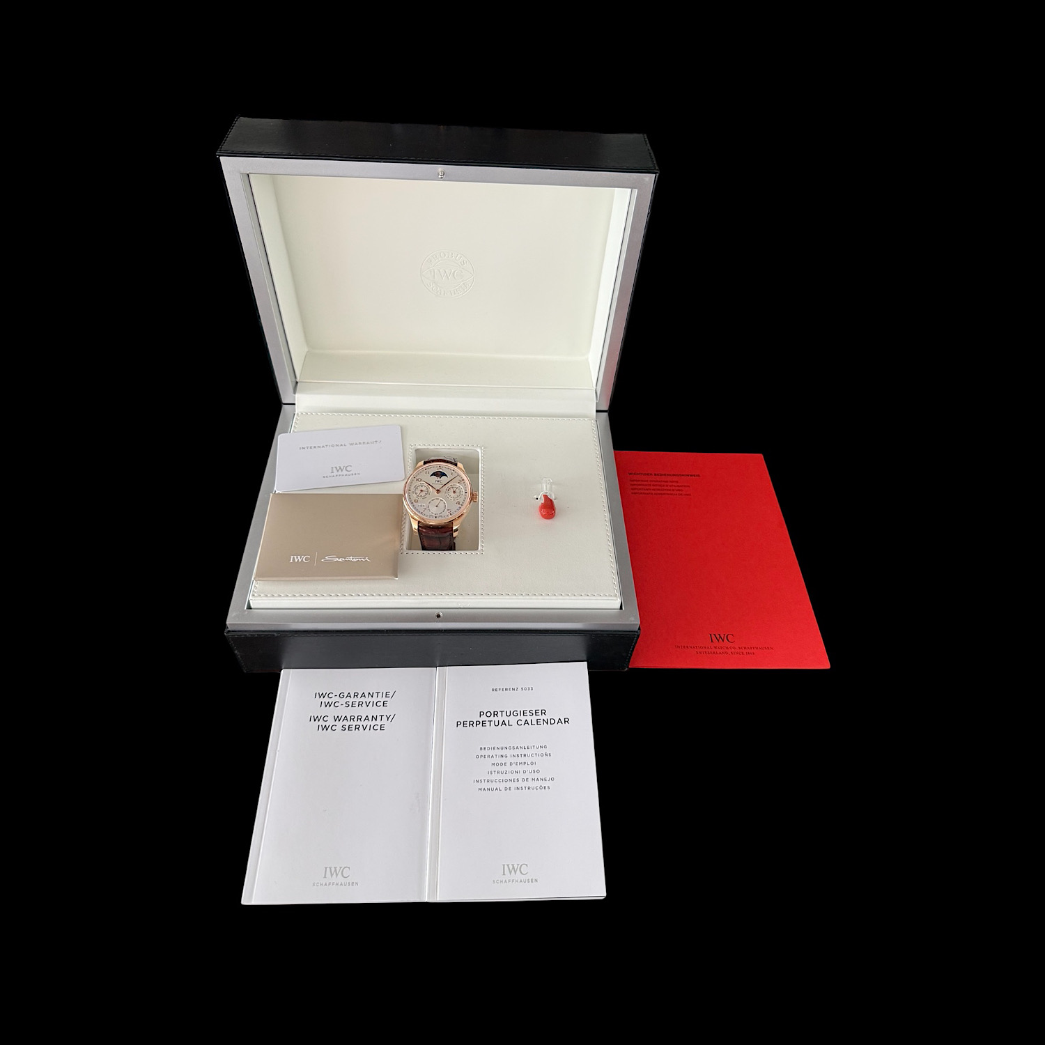 - Lieferumfang: IWC-Box (ohne Kissen), Glasröhrchen mit Jahreszahlen, Garantiekarte aus 2015, Bedienungsanleitung, Servicebooklet