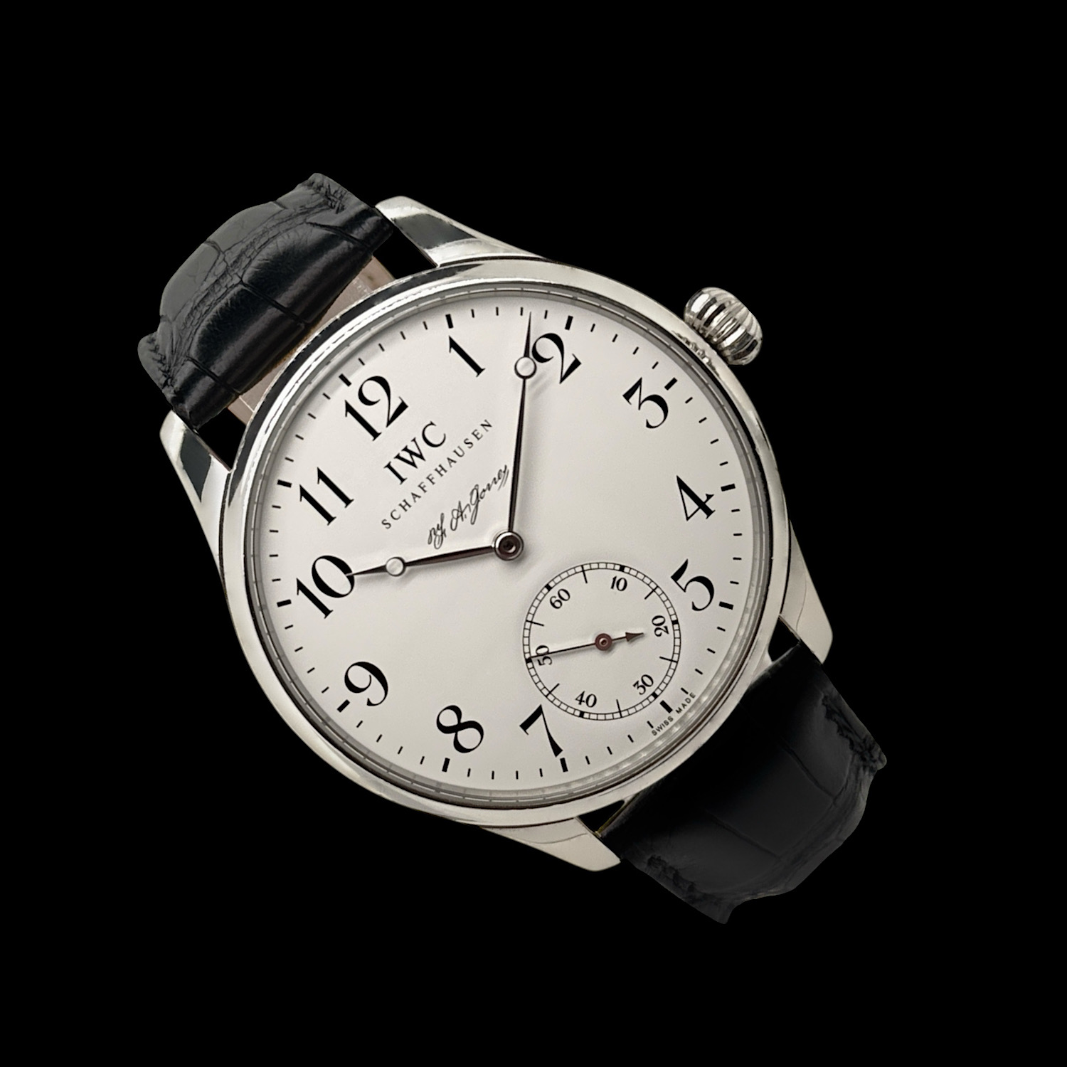 Eine Hommage an den Pioniergeist: Die IWC Portugieser F.A. Jones vereint zwei Legenden in einem Zeitmesser aus 950er Platin. Benannt nach Florentine Ariosto Jones, der 1868 die Manufaktur gründete, zelebriert diese auf 500 Stück limitierte Edition das Erbe traditioneller Handwerkskunst. Das Kaliber 98290 begeistert mit dem "Jones-Pfeil" – jenem verlängerten Rückerzeiger, der an die historischen Taschenuhrwerke erinnert. Durch den Saphirglasboden offenbart sich ein Meisterwerk: handgravierte Genfer Streifen, die Dreiviertelbrücke und in Chatons gefasste Steine. Das 43 Millimeter große Gehäuse mit weißem Zifferblatt, Breguet-Zeigern aus Weißgold und klassischer Minutenskala symbolisiert die Seele der ikonischen Portugieser-Kollektion. Die Uhr präsentiert sich in sehr gutem Zustand und wird mit der originalen F.A. Jones Uhrenbox mit Limitierungsnummer, Garantiekarte aus 2006 und zugehörigen Booklets übergeben.