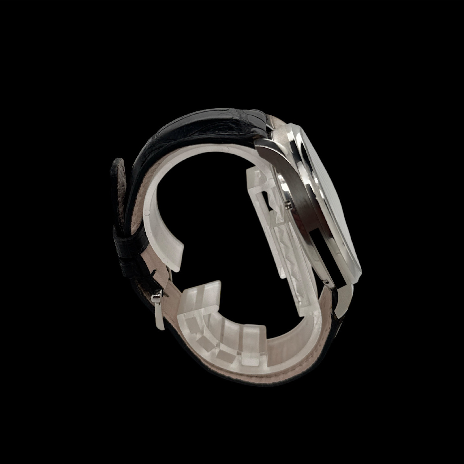 Das Armband wurde im Laufe der Zeit erneuert. Es ist die originale Dornschließe aus Platin montiert. Gerne unterstützen wir Sie bei der Beschaffung eines originalen IWC Armbandes.
