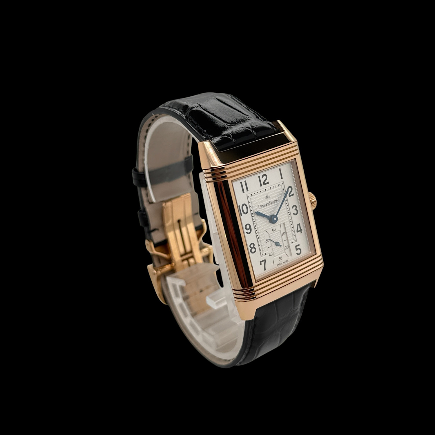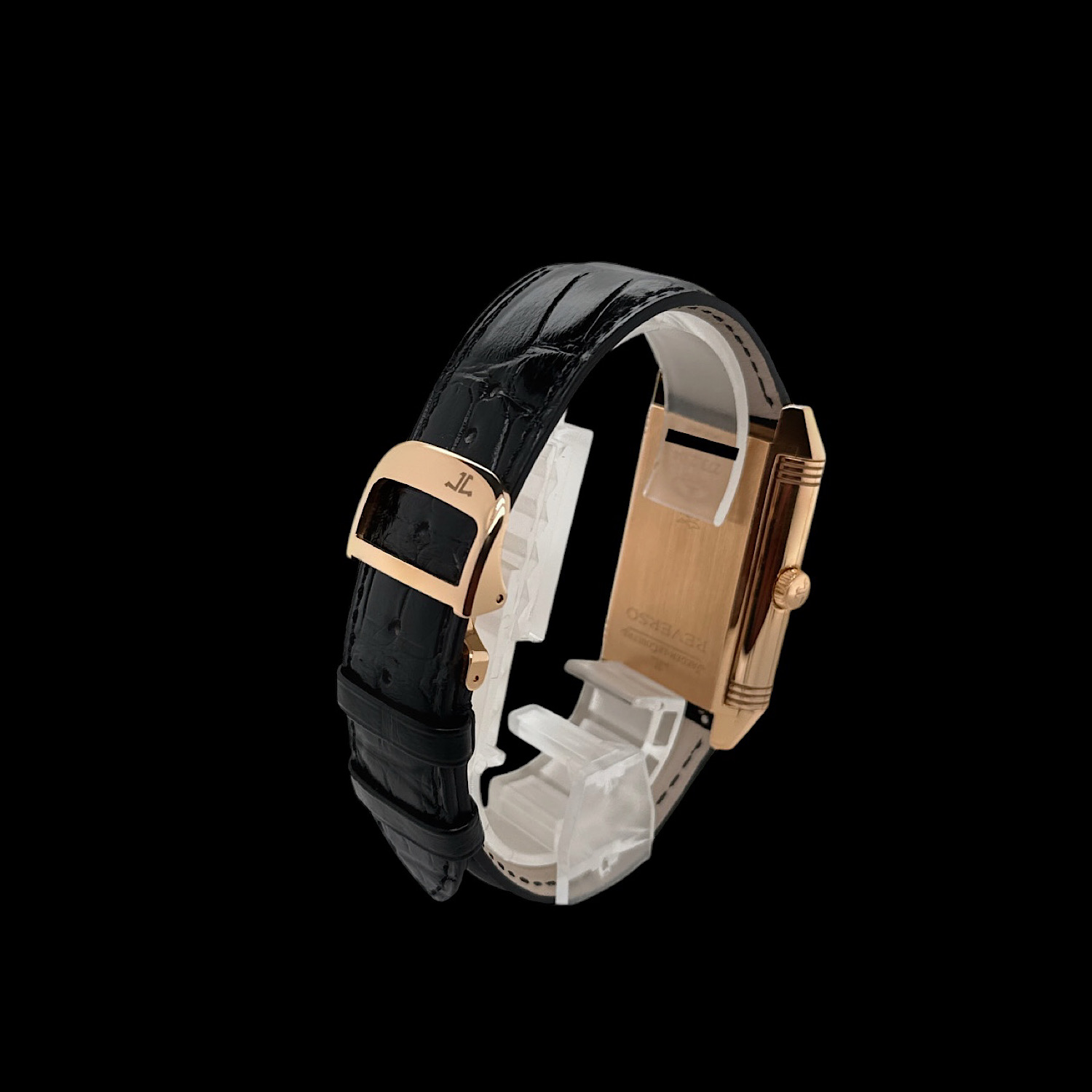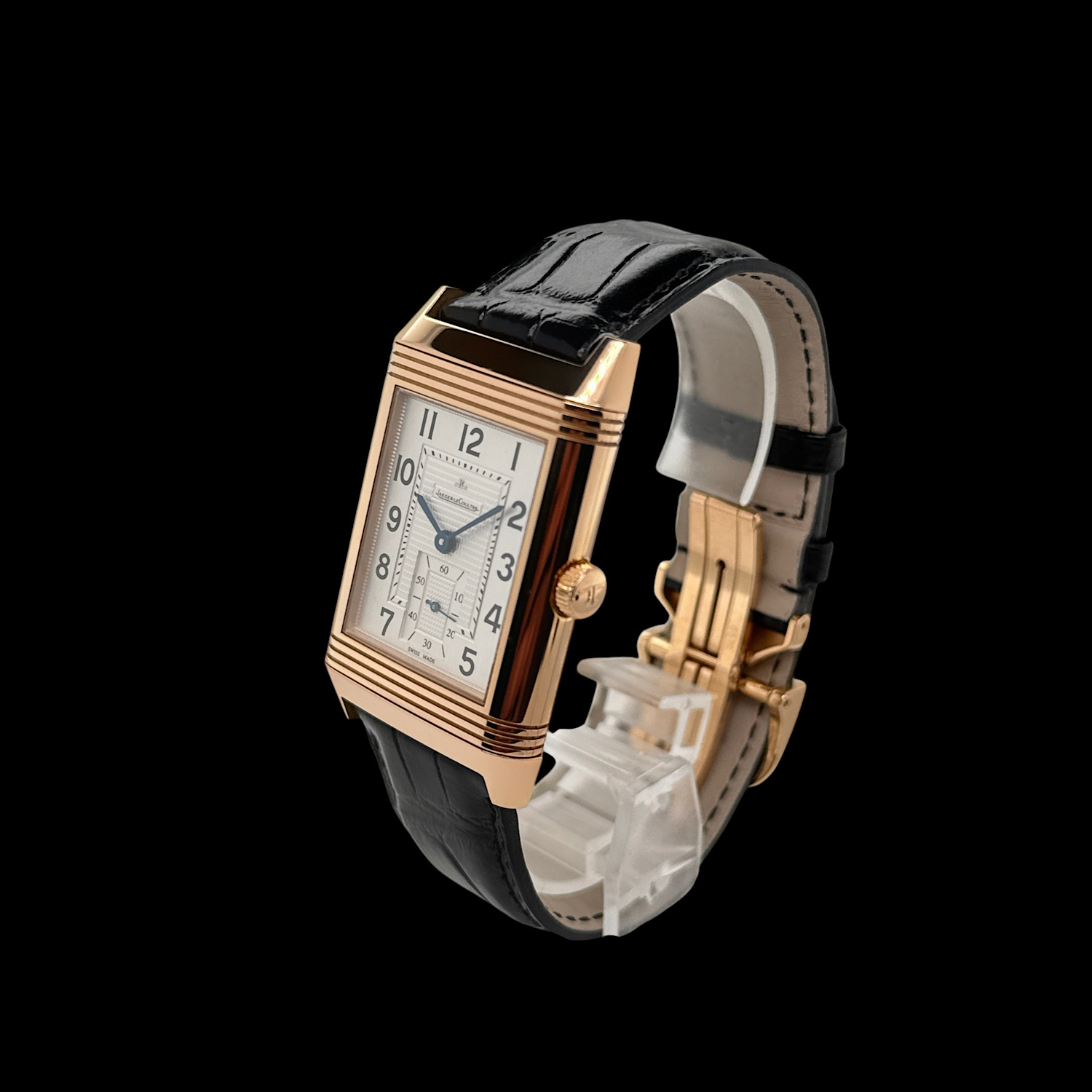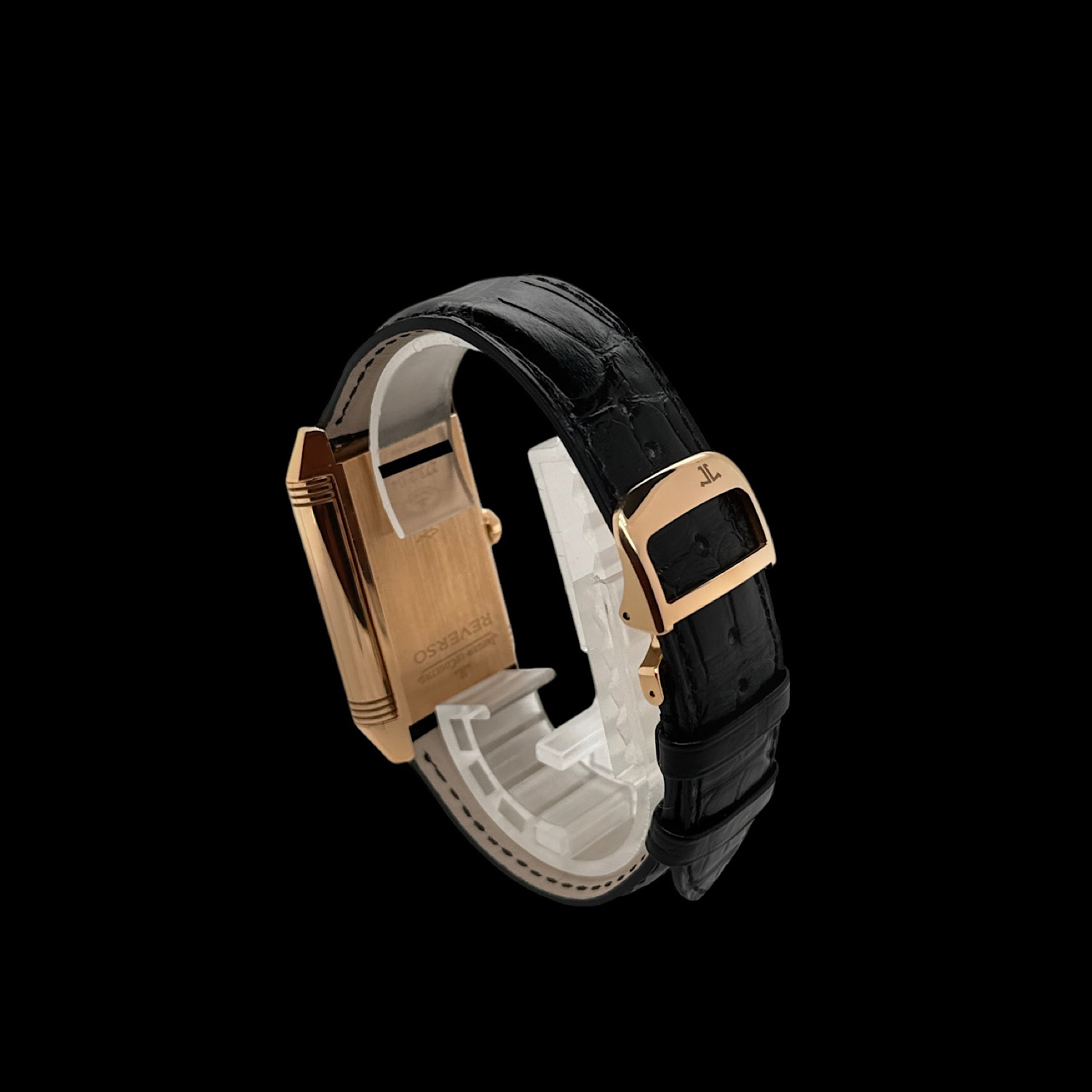 Das schwarze Jaeger-LeCoultre Lederarmband befindet sich in einem nahezu ungetragenen Zustand. Es ist die originale Faltschließe aus 18-karätigem Roségold montiert.