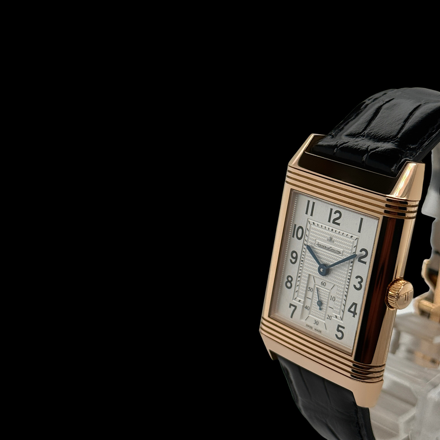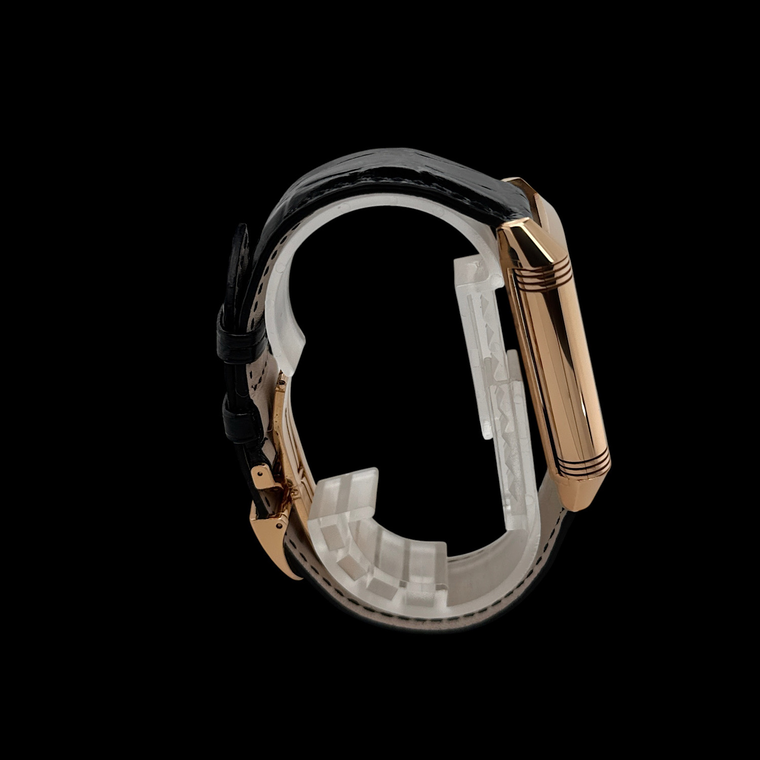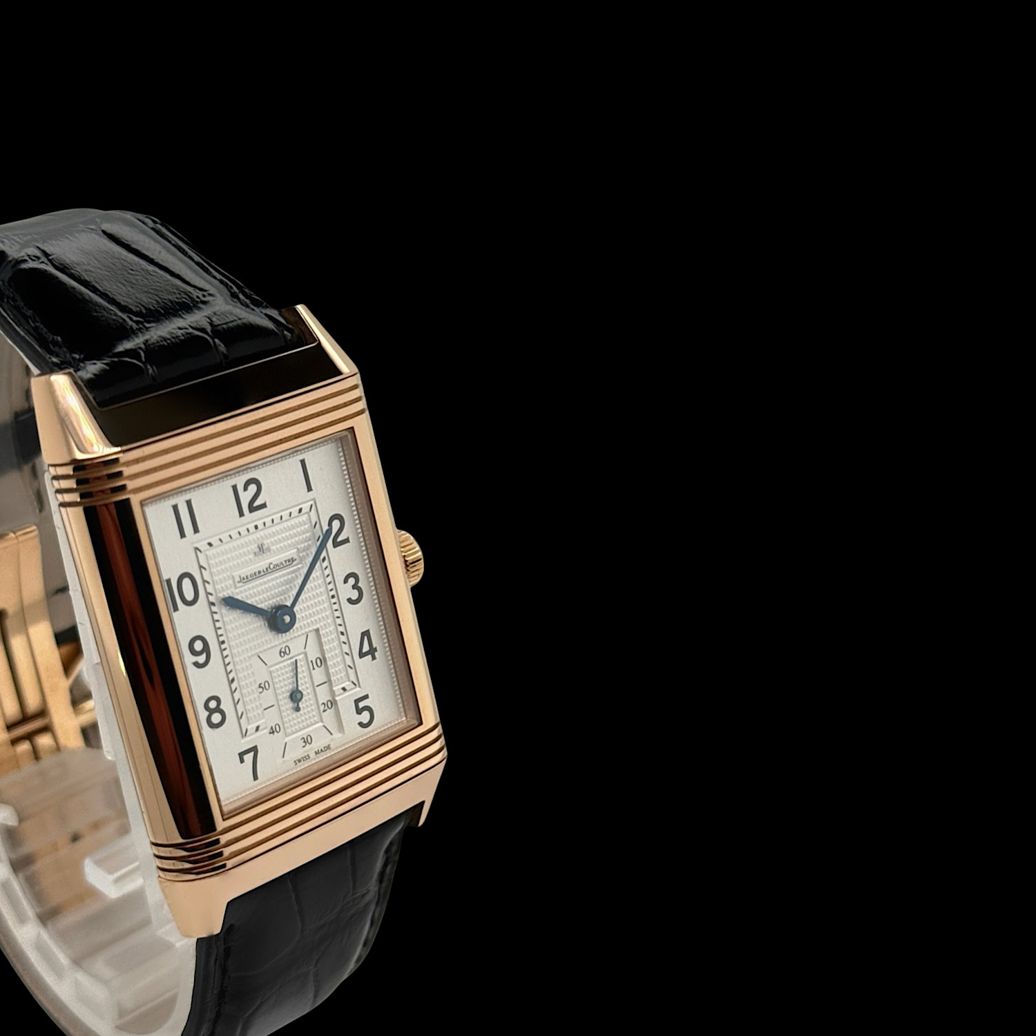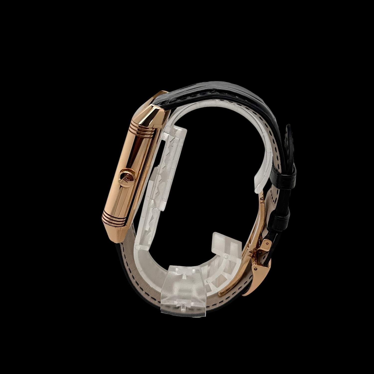 Das schwarze Jaeger-LeCoultre Lederarmband befindet sich in einem nahezu ungetragenen Zustand. Es ist die originale Faltschließe aus 18-karätigem Roségold montiert.
