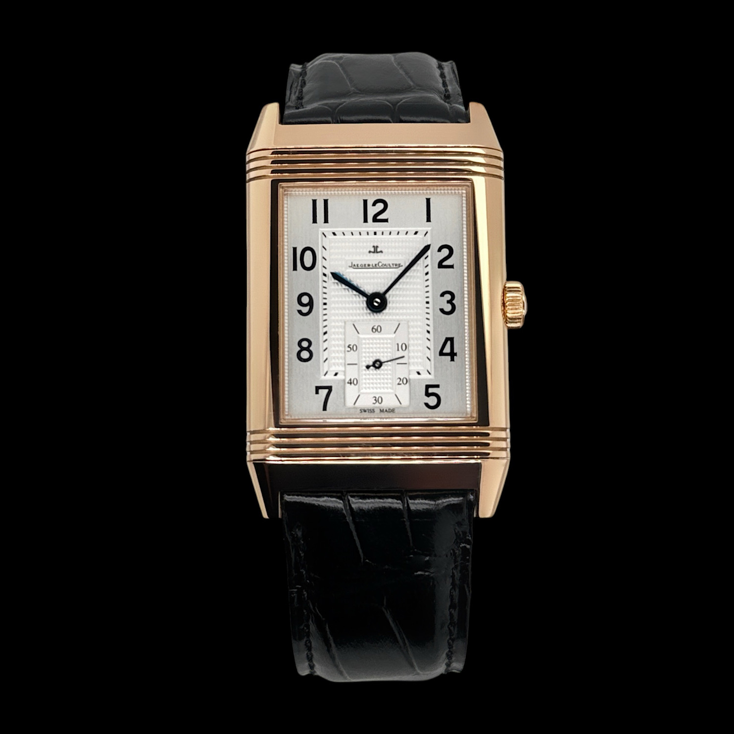 Diese Referenz Q3732420 in 18-karätigem Roségold ist zugleich die schlichteste, wie auch die edelste Ausführung der Grande Reverso 976: das guillochierte Silberzifferblatt mit arabischen Ziffern, gebläuten Zeigern und der kleinen Sekunde bei 6 Uhr strahlt eine Ruhe und Eleganz aus, die heutzutage selten geworden ist. Im Inneren arbeitet das Manufaktur-Handaufzugskaliber 976 mit 48 Stunden Gangreserve, sichtbar durch den Saphirglasboden. Das Gehäuse misst 30 × 48,5 mm und liegt dabei angenehm leicht am Handgelenk.