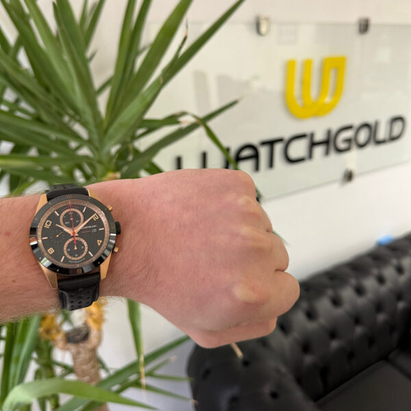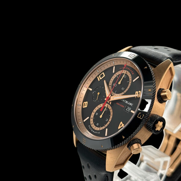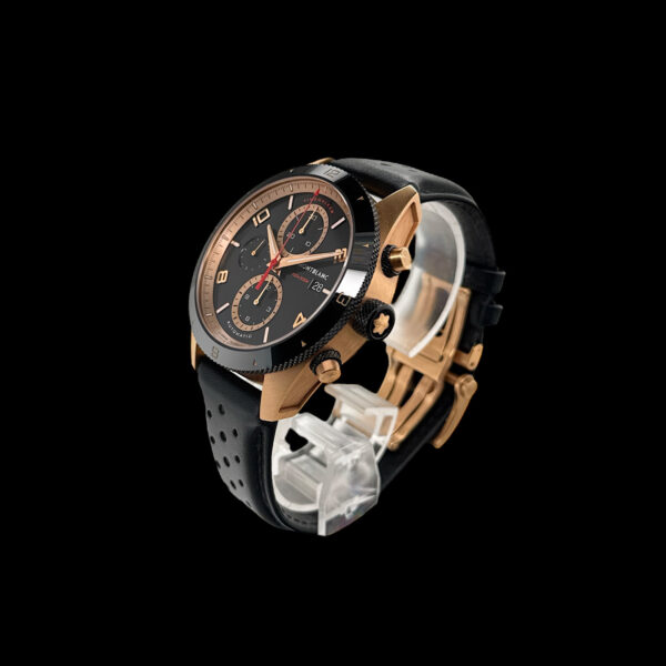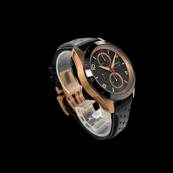 Das beeindruckende 43 Millimeter Gehäuse aus 18-karätigem Rotgold harmoniert perfekt mit der schwarzen Keramiklünette. Diese drehbare Lünette ermöglicht das Ablesen einer zweiten Zeitzone und unterstreicht den motorsportinspirierten Charakter. Das tiefschwarze Zifferblatt mit prägnanten Totalisatoren, roten Akzenten und der charakteristischen Chrono-Sekunde mit Minerva-Pfeil verleiht dieser Herrenuhr ihre unverwechselbare Ausstrahlung. Die mit Super-LumiNova versehenen Zeiger und Indizes gewährleisten optimale Ablesbarkeit auch bei Dunkelheit.