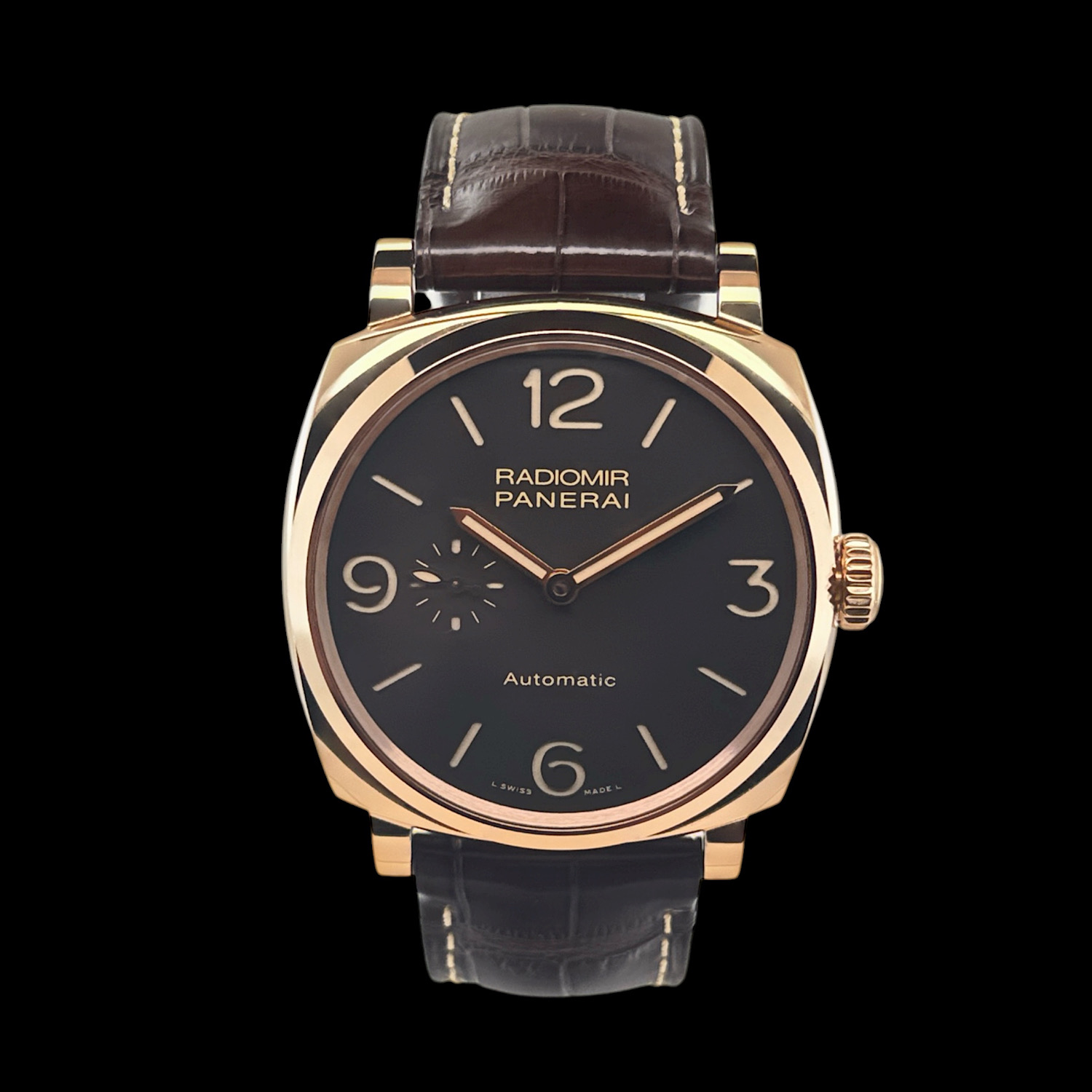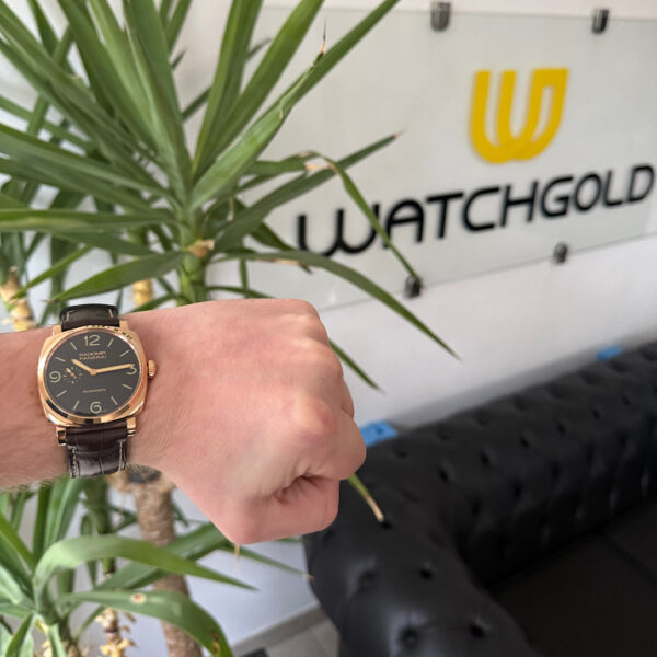Das charakteristische 45mm Radiomir-1940-Gehäuse aus edlem 18-karätigen Roségold greift die ikonische Formensprache historischer Panerai-Militäruhren auf, die bereits in den 1940er-Jahren durch robuste Bandanstöße perfektioniert wurde. Das warme braune Sandwich-Zifferblatt mit dezenter kleiner Sekunde bei 9 Uhr schafft eine zeitlose Harmonie zwischen männlicher Eleganz und dezenter Exklusivität.