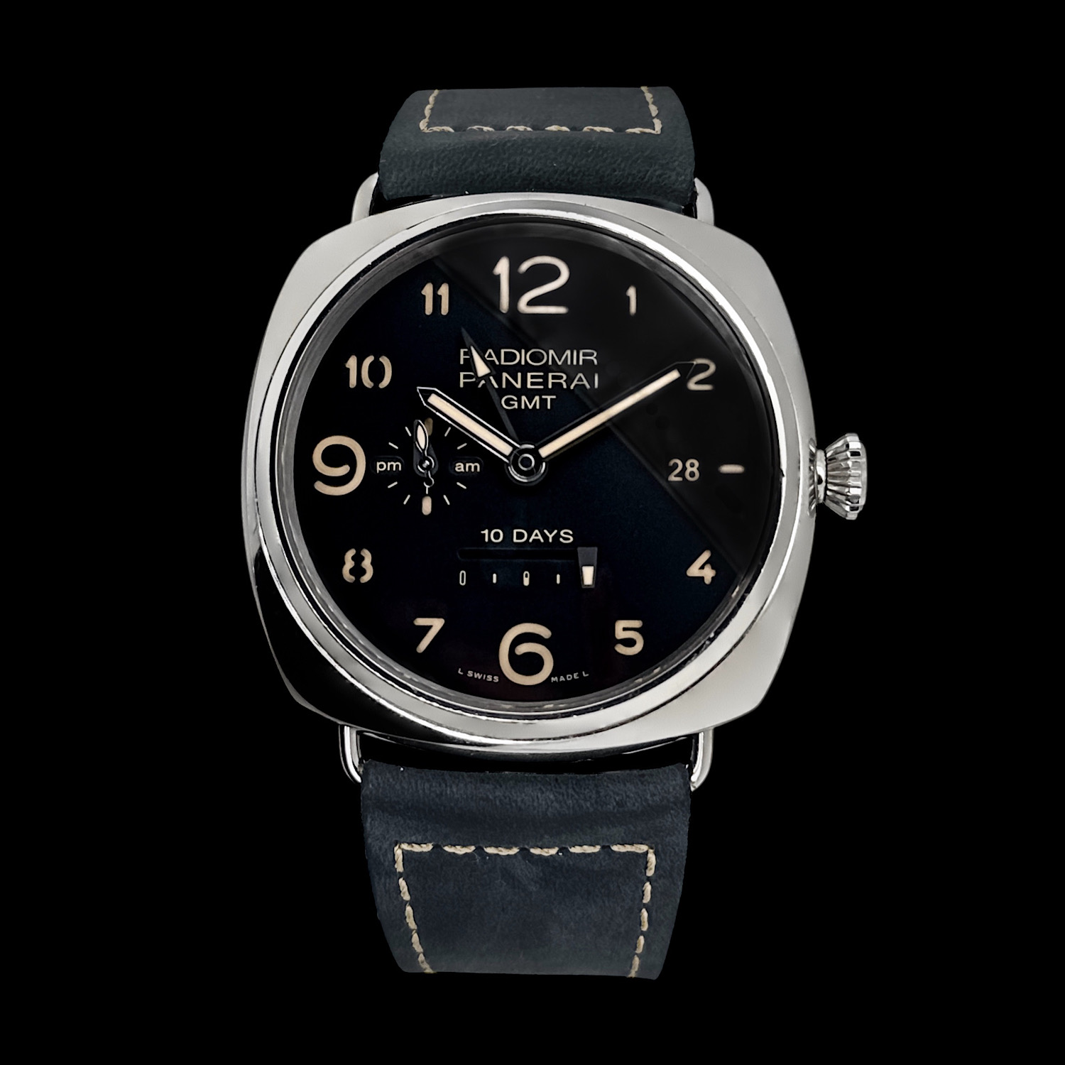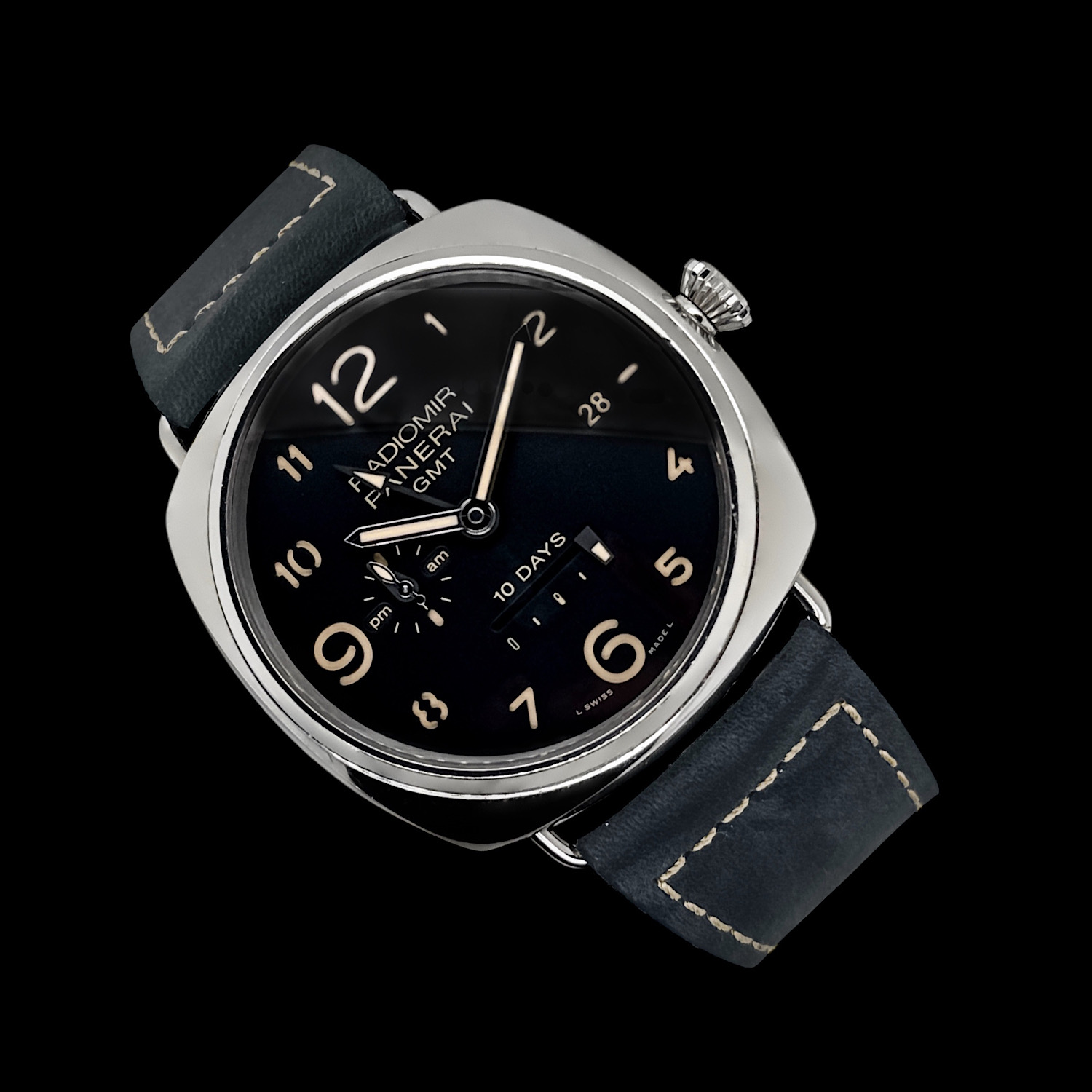 Das 47 Millimeter große Edelstahlgehäuse vereint die ikonische Radiomir-Form mit dem außergewöhnlichen Manufakturkaliber P.2003. Das schwarze Zifferblatt zeigt klar die Zeit, eine Gangreserveanzeige, die GMT-Funktion und eine Datumsanzeige. Ein handgenähtes graues Lederband betont den extravaganten Charakter, während ein schwarzes Glattlederband elegante Vielseitigkeit bietet.