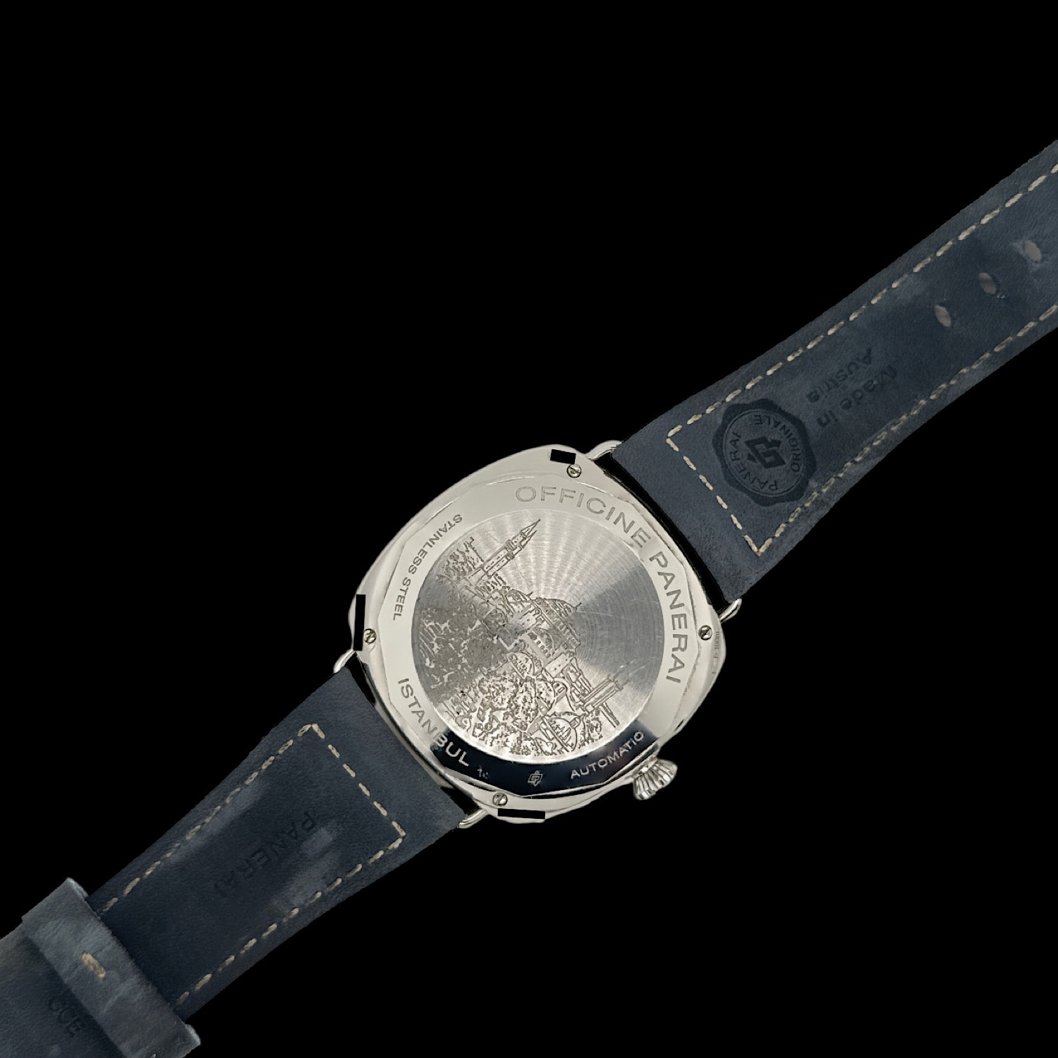 Nur 35 Mal wurde diese außergewöhnliche Radiomir für die Panerai-Boutique in Istanbul geschaffen – eine Hommage an die Stadt, die Kontinente verbindet. Auf dem Gehäuseboden erzählt die gravierte Hagia Sophia mit ihren vier charakteristischen Minaretten von über 1.500 Jahren Geschichte, vom Wandel zwischen Welten und Kulturen. Diese Uhr trägt Istanbul im Herzen.