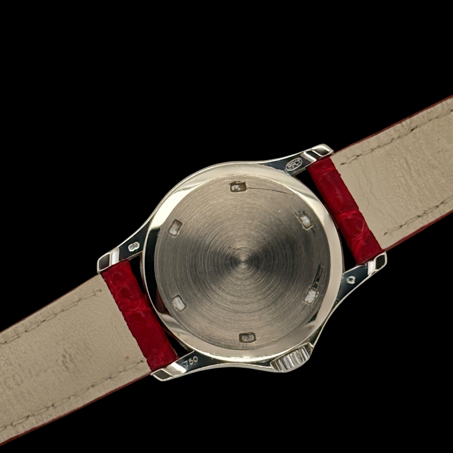 Diese um 2001 gefertigte Calatrava präsentiert sich in sehr gutem Zustand. Das massive Weißgoldgehäuse mit passender Schließe zeigt kaum Gebrauchsspuren, das feine Lederband ist originalgetreu konfektioniert. Die Uhr wird mit den originalen Patek-Philippe-Papieren aus 2001 geliefert – eine wichtige Dokumentation der Herkunft für anspruchsvolle Sammlerinnen.