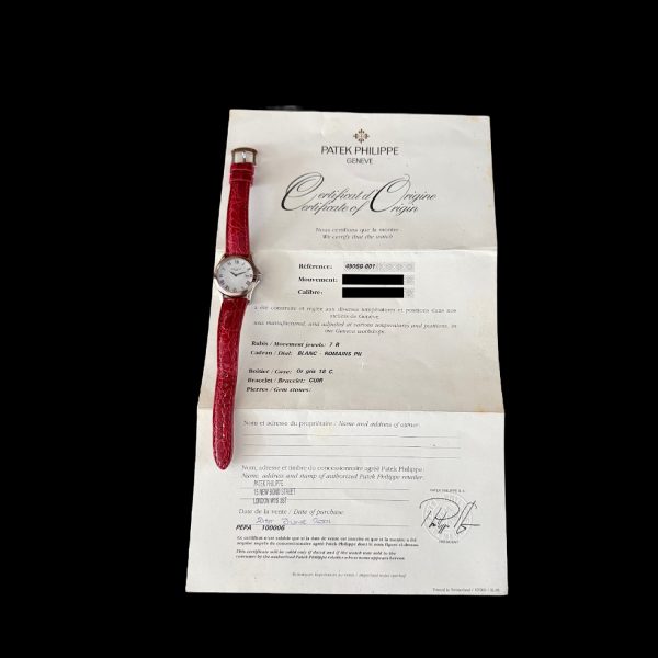 Das Lederarmband wurde im Laufe der Zeit erneuert, gerne sind wir Ihnen bei der Suche nach einem originalen Patek Philippe Armband behilflich. Die Patek Philippe Dornschließe befindet sich in sehr gutem Zustand.