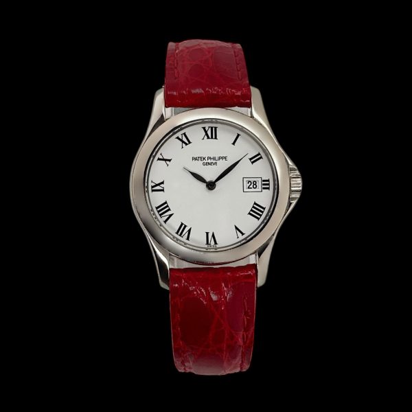 Das Calatrava Gehäuse aus 18-karätigem Weißgold befindet sich in sehr gutem Zustand mit nur minimalen Tragespuren.