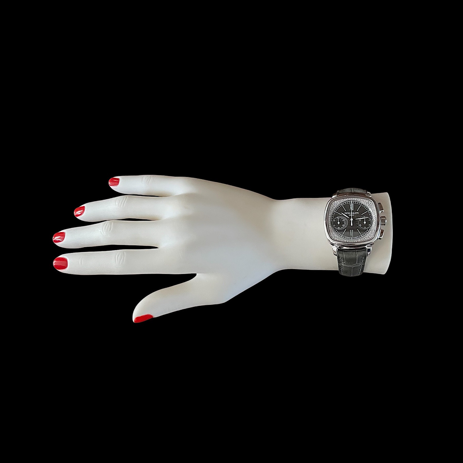 Das anthrazitfarbene, brillantbesetzte Zifferblatt befindet sich in tadellosem Zustand.