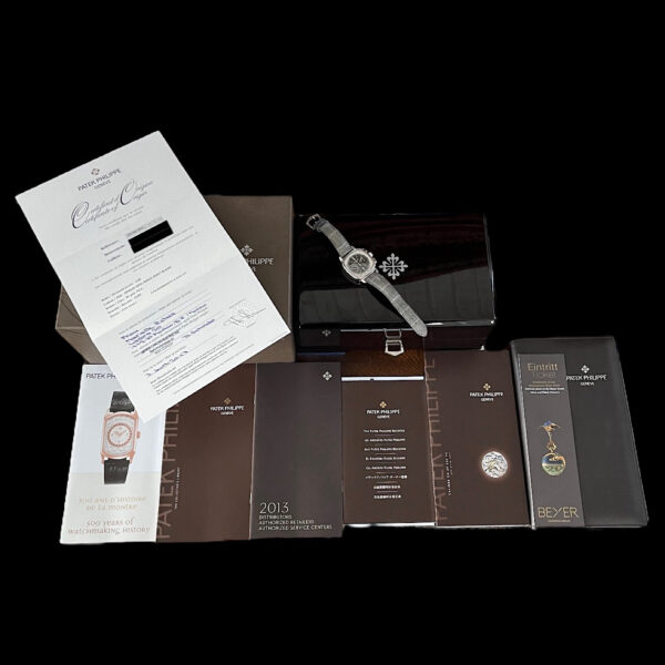 Diese luxuriöse Uhr wird mit umfassendem Zubehör geliefert: Originale Patek Philippe Holzbox samt Umkarton, Certificat d'Origin, ein edles Ledermäppchen, zahlreiche Booklets und eine Eintrittskarte für das renommierte Uhrenmuseum Beyer in Zürich.