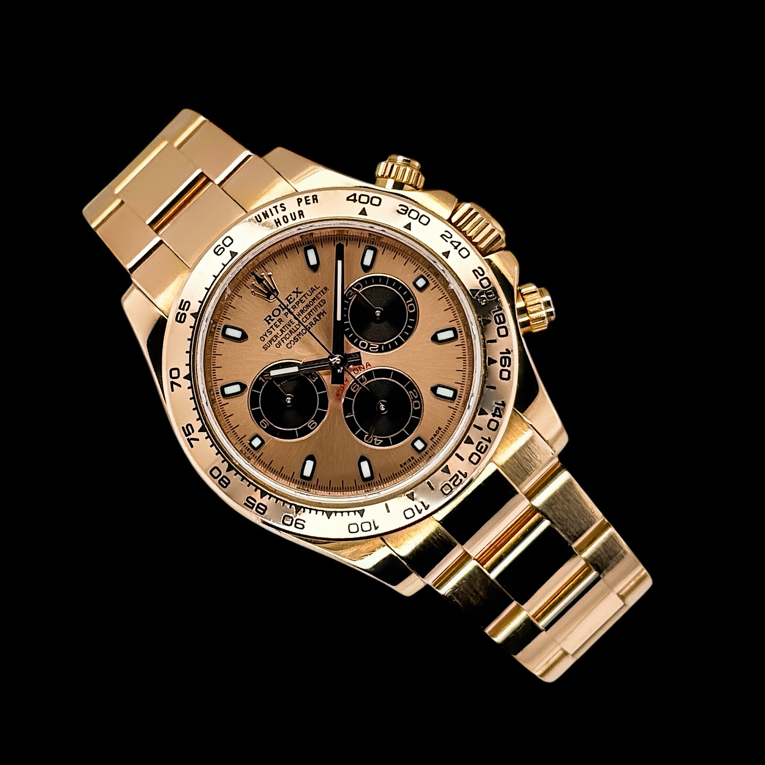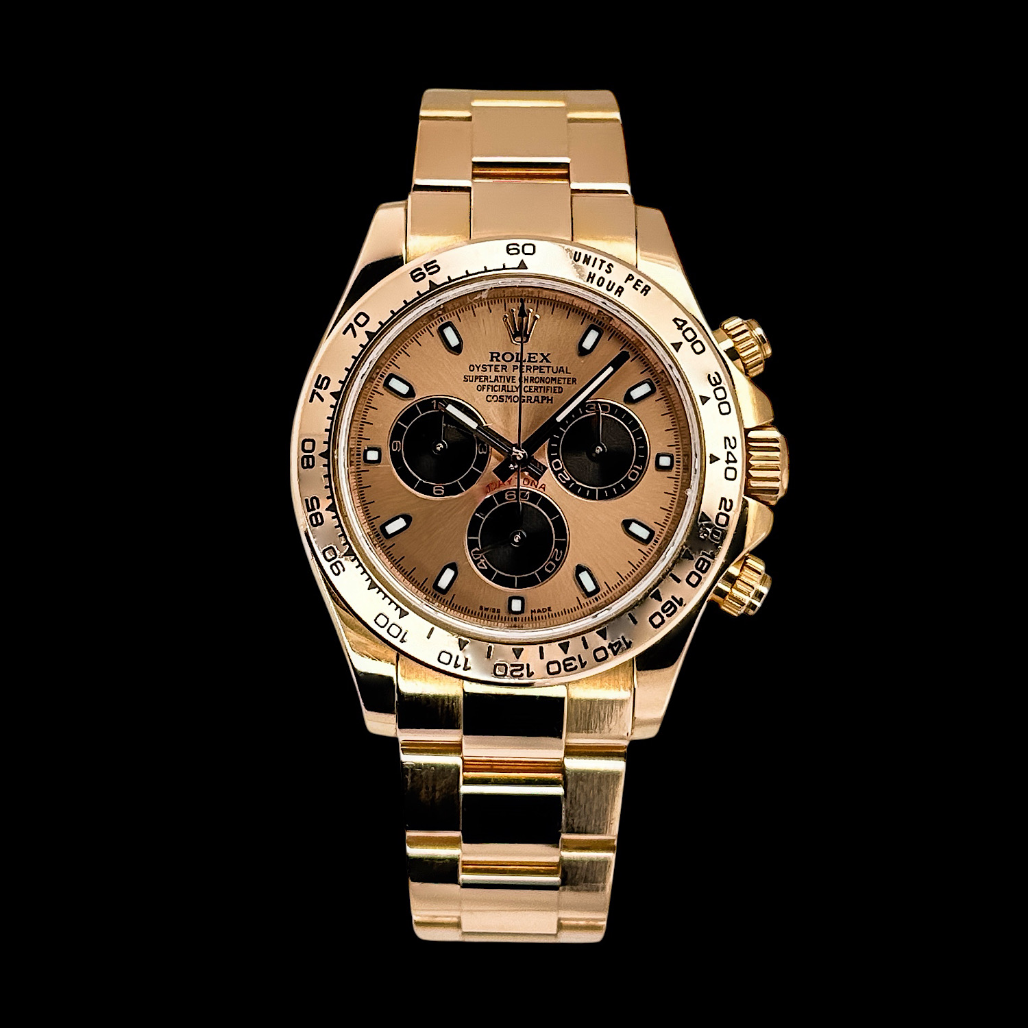 Die Rolex Cosmograph Daytona, Referenz 116505, verkörpert seit ihrer Einführung im Jahr 2008 die perfekte Symbiose aus motorsportlicher Tradition und zeitgenössischer Luxusästhetik. Gefertigt aus 18-karätigem Everose Gold, präsentiert sich dieser ikonische Chronograph als Meisterwerk exklusiver Uhrmacherkunst. Die hauseigene Roségold-Legierung mit Platin-Zusatz garantiert dauerhafte Farbbeständigkeit und verleiht der Uhr ihre charakteristische warme Ausstrahlung, die niemals verblasst.