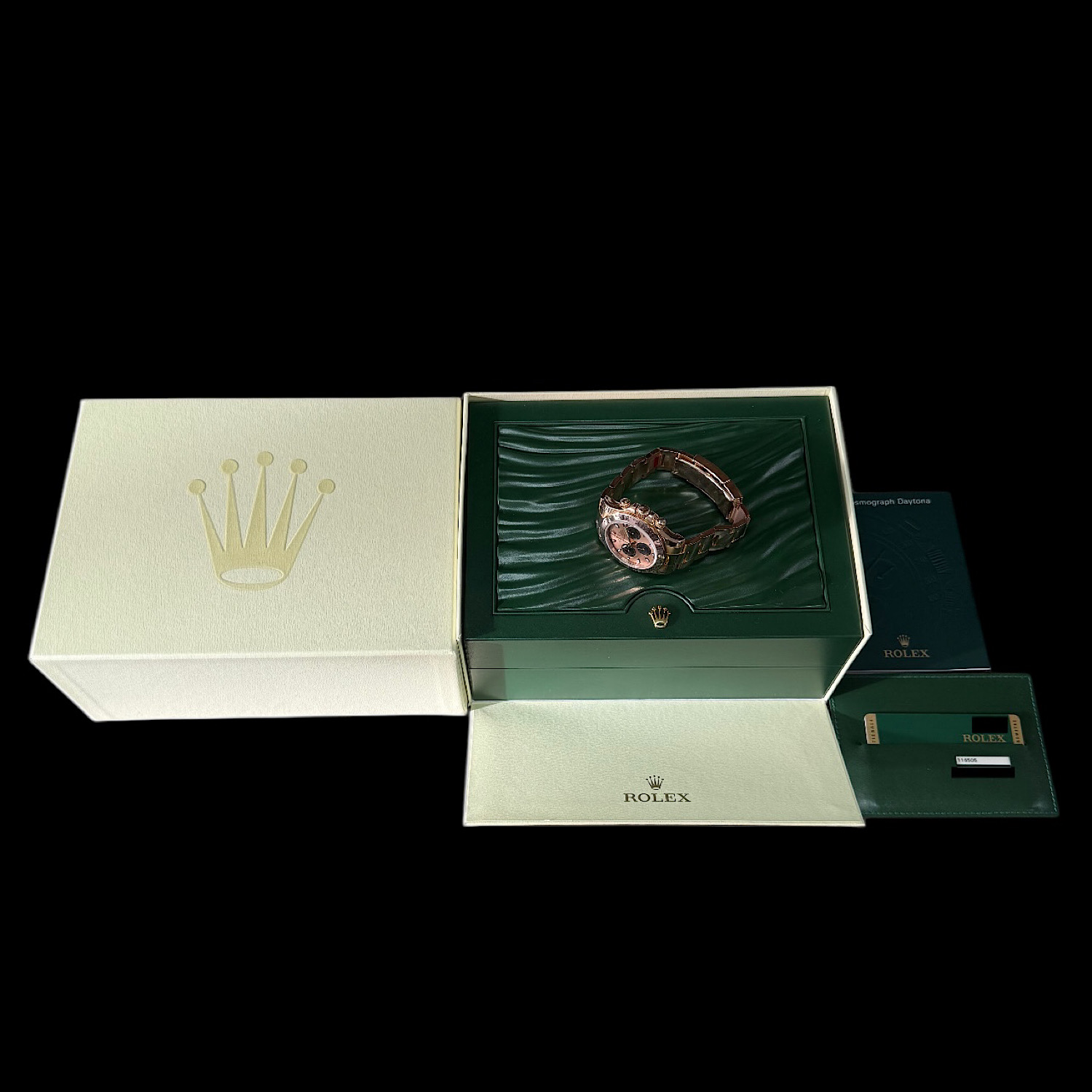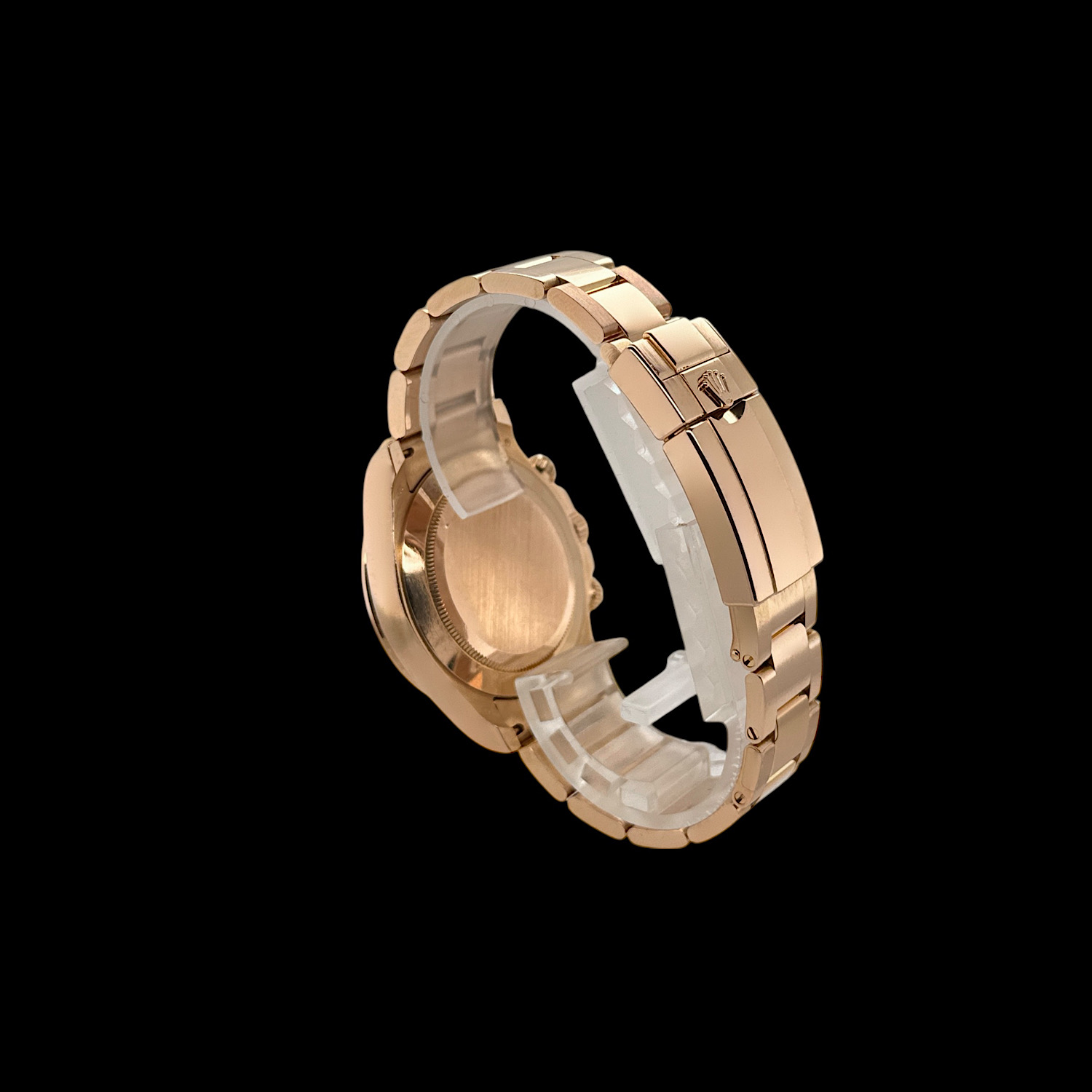 Im Inneren arbeitet das vollständig manufakturintern entwickelte Kaliber 4130, ein Meilenstein der Chronographentechnik. Das COSC-zertifizierte Automatikwerk mit 72 Stunden Gangreserve gilt als eines der zuverlässigsten Chronographenwerke überhaupt. Die paramagnetische Parachrom-Spirale bietet höchste Präzision und Widerstandsfähigkeit gegen Magnetfelder und Temperaturschwankungen. Das Oyster-Gliederarmband aus Everose Gold mit Oysterlock-Sicherheitsfaltschließe garantiert optimalen Tragekomfort und sichere Befestigung am Handgelenk.