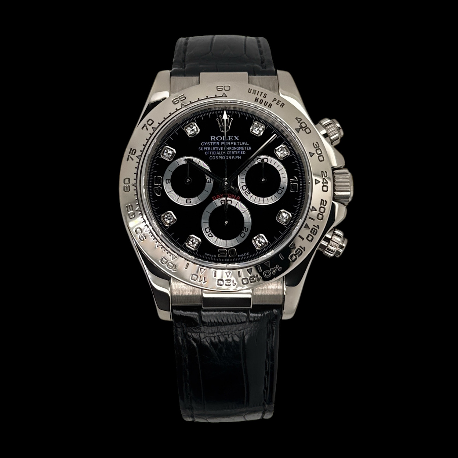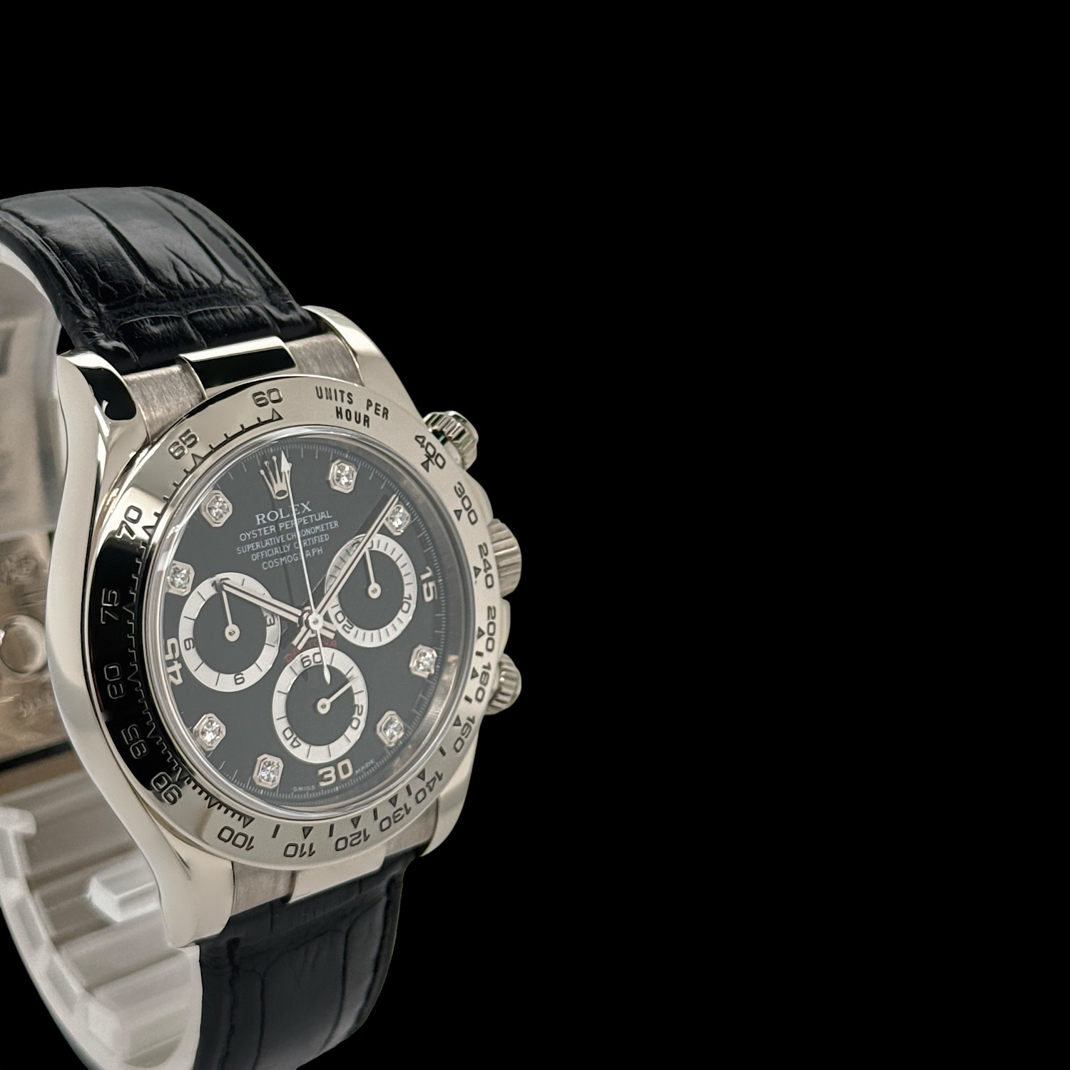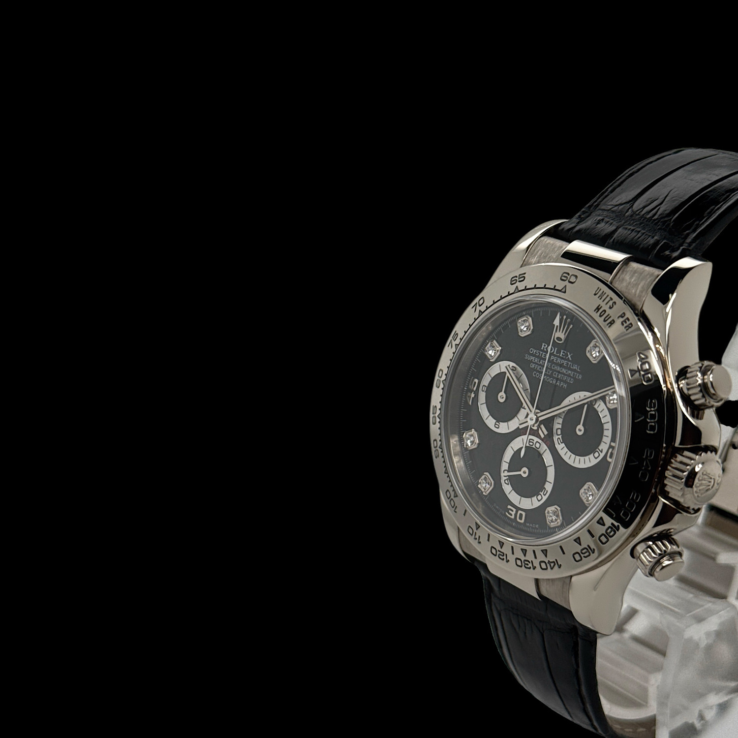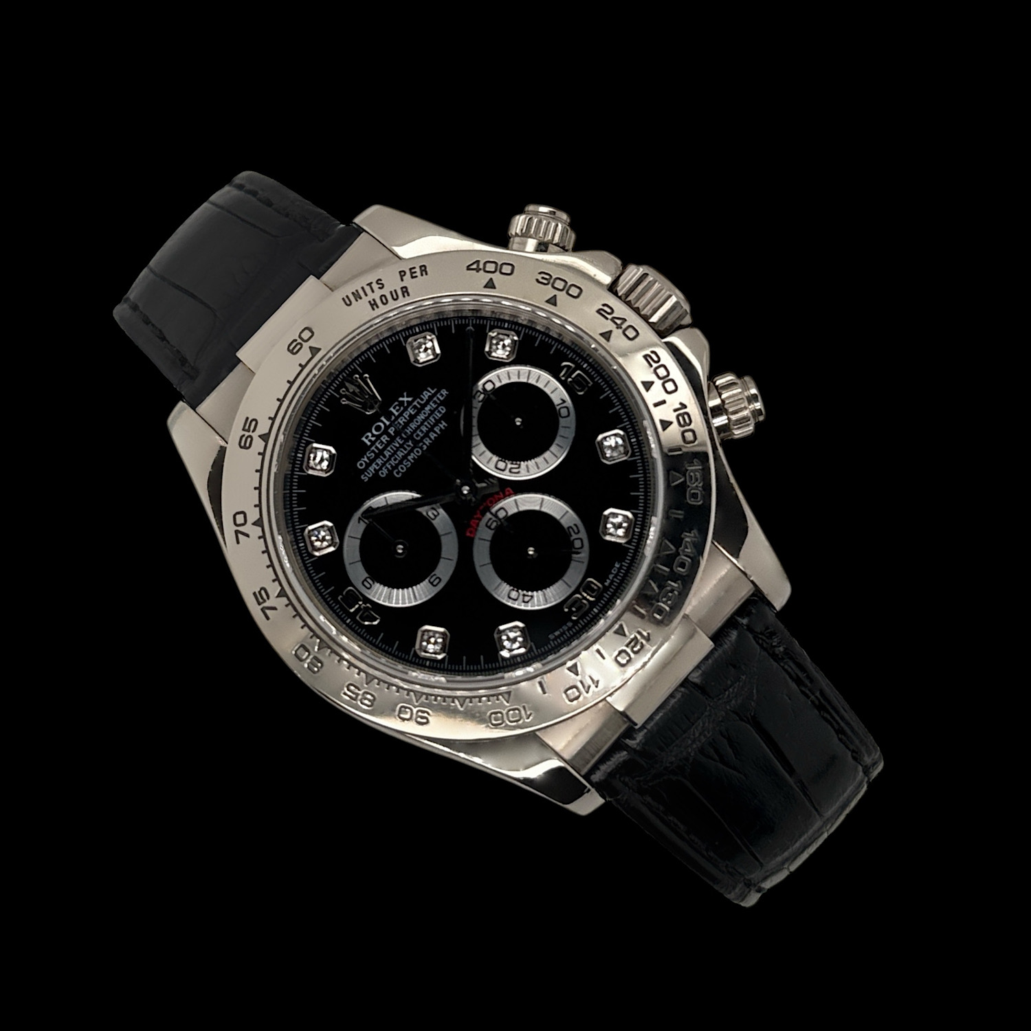 Das tiefschwarze Zifferblatt funkelt durch brillantbesetzte Stundenindizes, während die drei Totalisatoren mit ihren silbernen Ringen sanfte Kontraste schaffen. Weißgold hat eine dezente Ausstrahlung – auffallend, aber nie aufdringlich. Die polierte Lünette und das schwarze Lederband machen diese Daytona zur perfekten Begleiterin zwischen Rennstrecke und Konferenzraum.