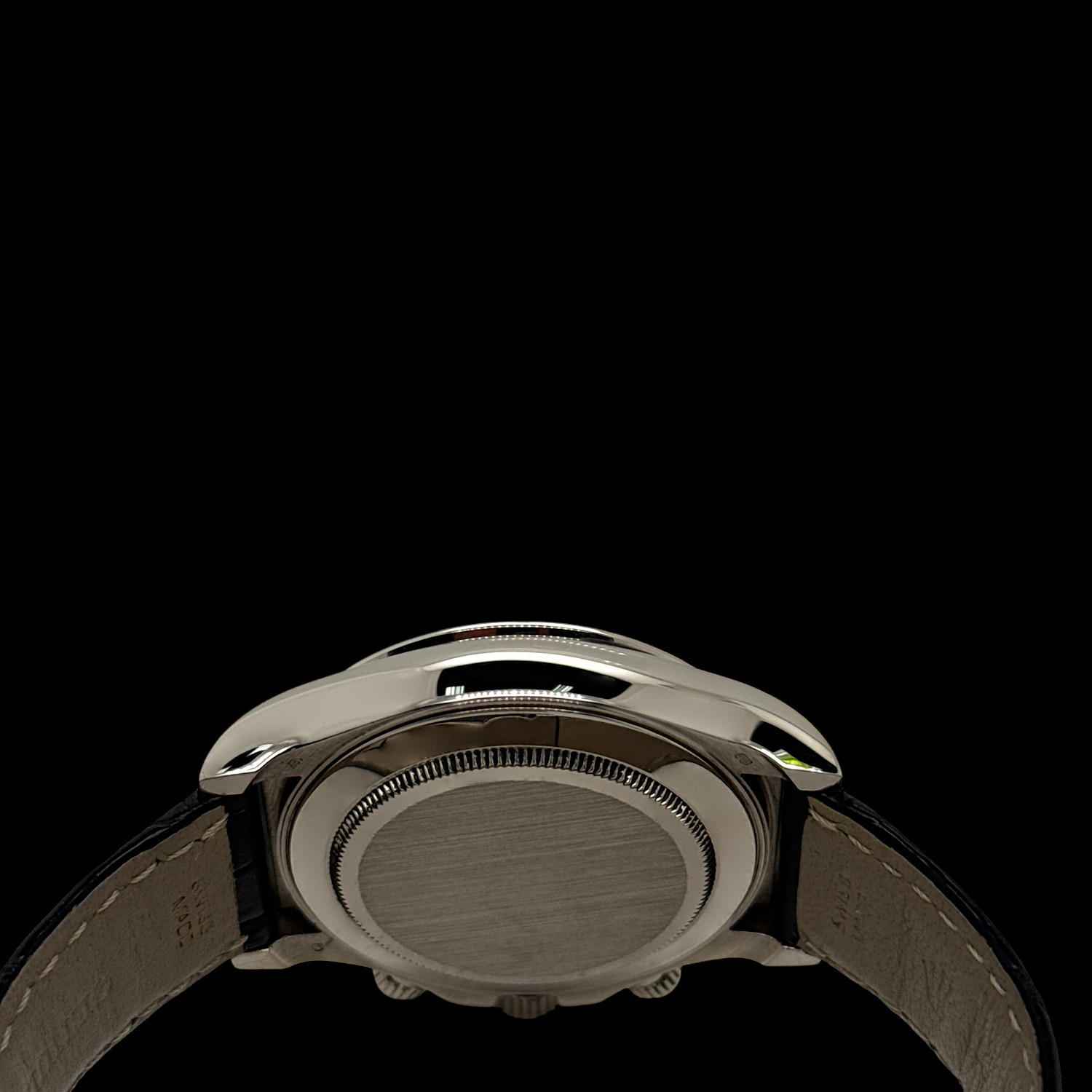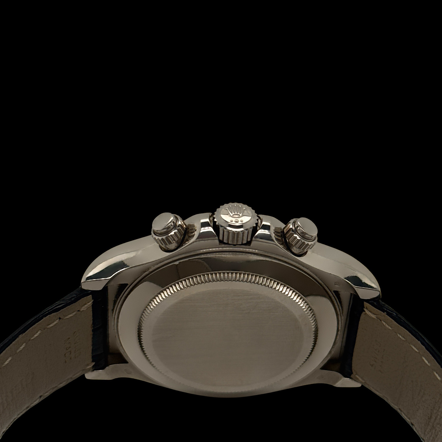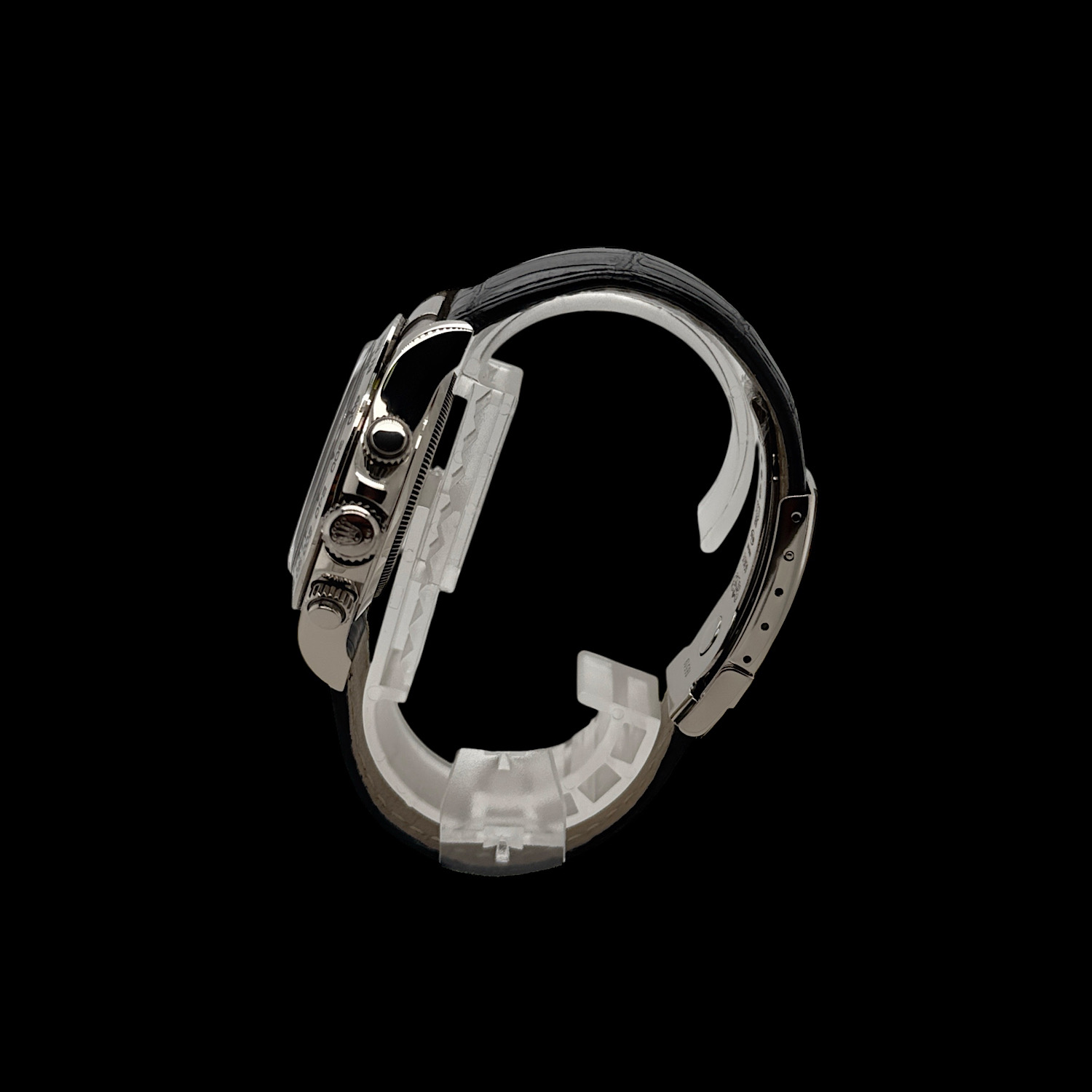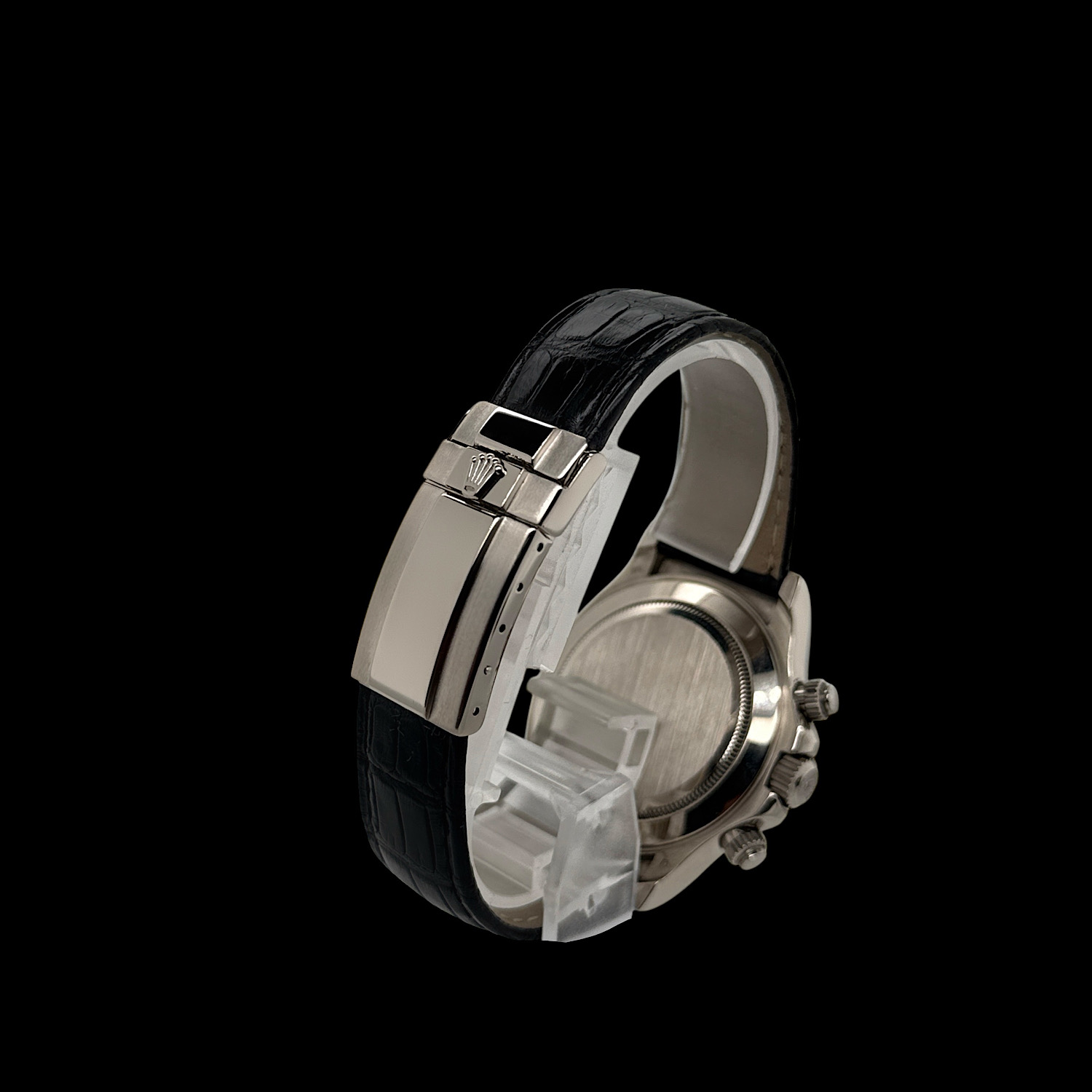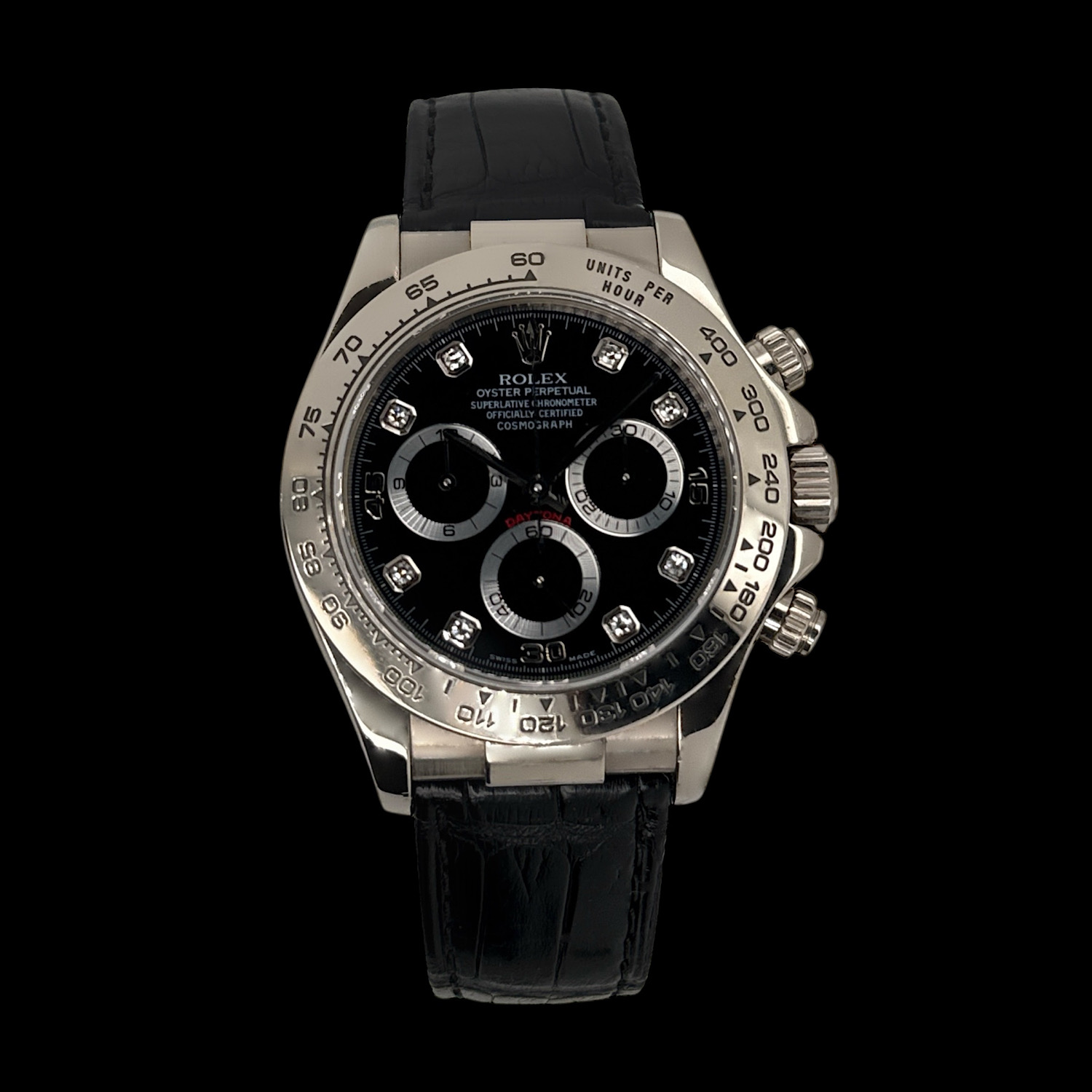 Das tiefschwarze Zifferblatt funkelt durch brillantbesetzte Stundenindizes, während die drei Totalisatoren mit ihren silbernen Ringen sanfte Kontraste schaffen. Weißgold hat eine dezente Ausstrahlung – auffallend, aber nie aufdringlich. Die polierte Lünette und das schwarze Lederband machen diese Daytona zur perfekten Begleiterin zwischen Rennstrecke und Konferenzraum.