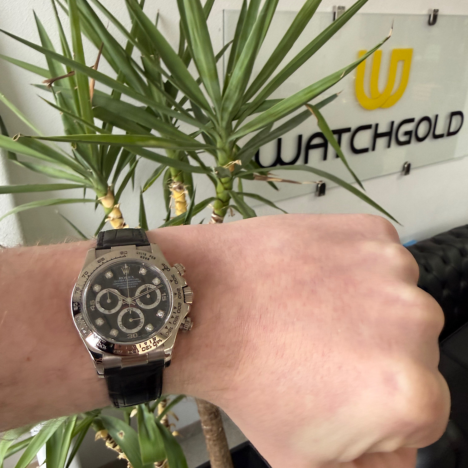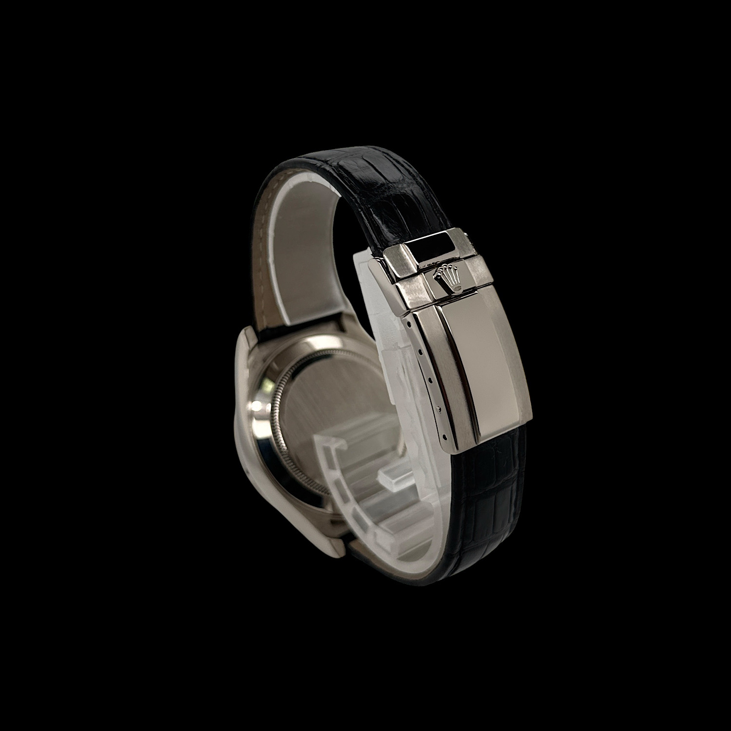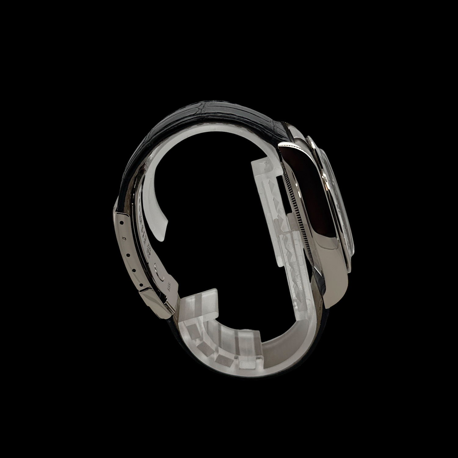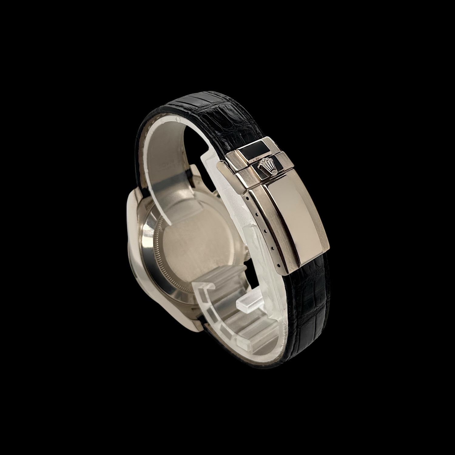 Das tiefschwarze Zifferblatt funkelt durch brillantbesetzte Stundenindizes, während die drei Totalisatoren mit ihren silbernen Ringen sanfte Kontraste schaffen. Weißgold hat eine dezente Ausstrahlung – auffallend, aber nie aufdringlich. Die polierte Lünette und das schwarze Lederband machen diese Daytona zur perfekten Begleiterin zwischen Rennstrecke und Konferenzraum.