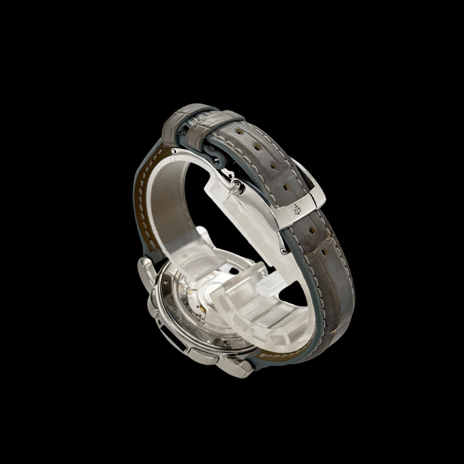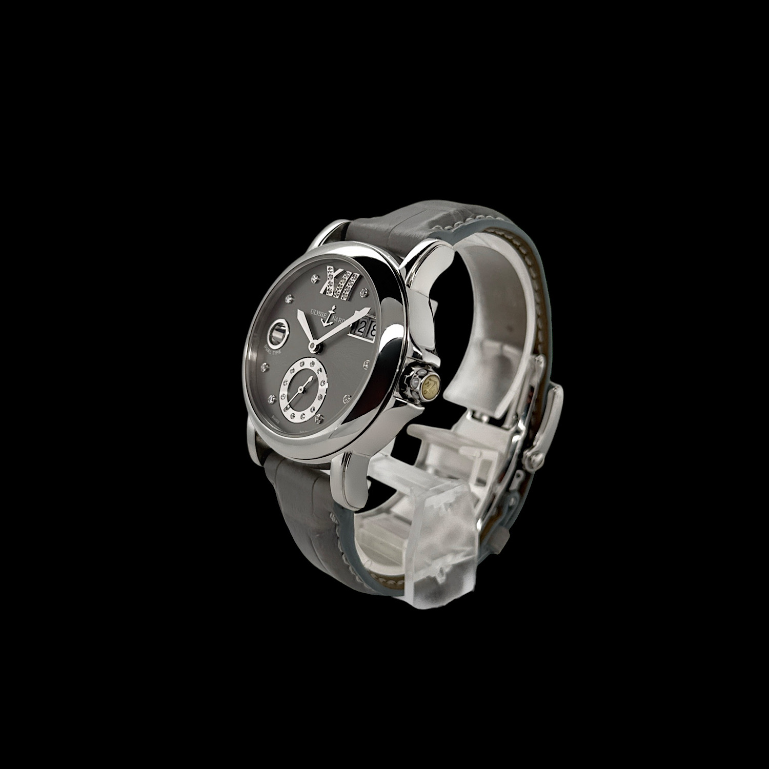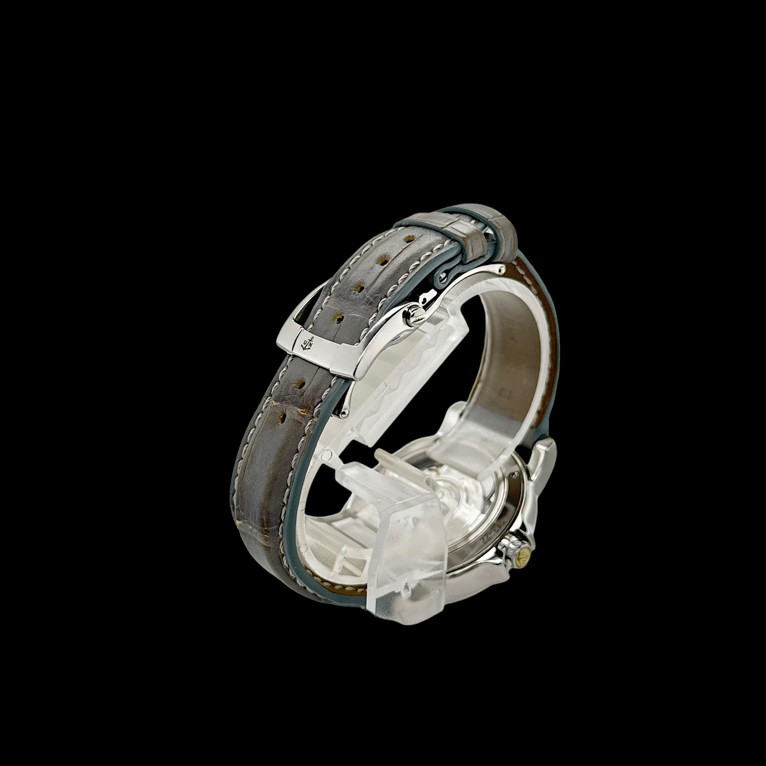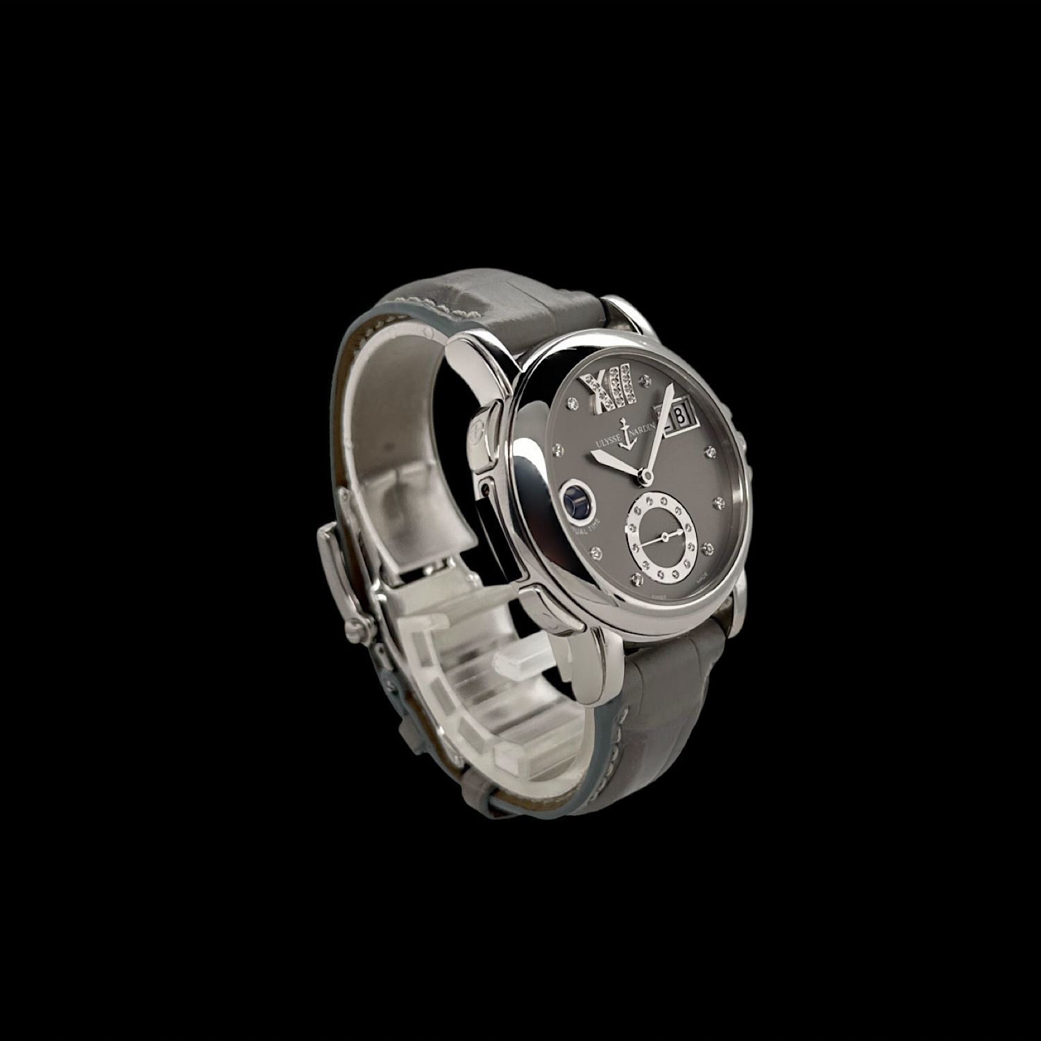 Das kompakte Edelstahlgehäuse misst 37 Millimeter im Durchmesser und bietet damit klassische Damenuhr-Proportionen mit modernem Charakter. Das mit Brillanten besetzte graue Zifferblatt zeigt neben Stunden, Minuten und kleiner Sekunde bei sechs Uhr eine große Datumsanzeige bei zwei Uhr sowie die permanente Heimatzeitanzeige im 24-Stunden-Format bei neun Uhr. Die zweite Zeitzone lässt sich mittels zweier Drücker an der linken Gehäuseseite mühelos vorwärts oder rückwärts verstellen, während das Datum automatisch mitspringt. Ein Saphirglas-Sichtboden gewährt Einblick in die feine Werksarchitektur des automatischen Kalibers UN-24. Das originale Lederarmband mit Faltschließe aus Edelstahl komplettiert die elegante Erscheinung und verleiht der Uhr einen zeitlos-stilvollen Charakter.