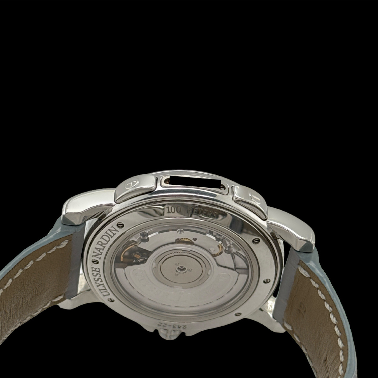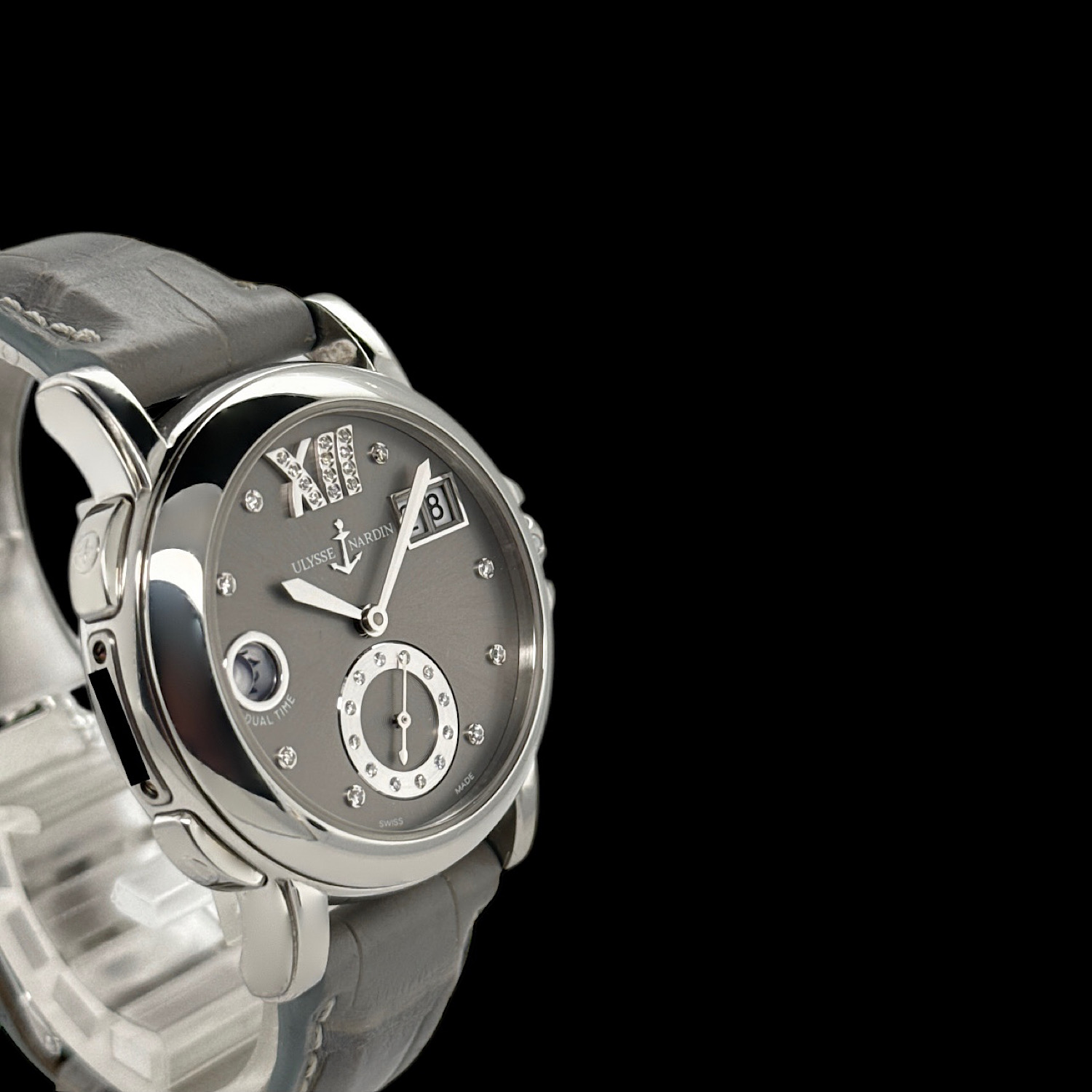 Die Ulysse Nardin Dualtime, Referenz 243-22, vereint das maritime Erbe der legendären Schweizer Manufaktur mit elegantem Damenuhr-Design und praktischer Reisetauglichkeit. Seit 1846 steht Ulysse Nardin für nautische Präzisionsinstrumente und belieferte mehr als 50 Marinen weltweit mit hochgenauen Chronometern. Diese Philosophie der Präzision und Innovation spiegelt sich in der Dualtime wider, die als intelligenter Begleiter für Vielreisende konzipiert wurde.